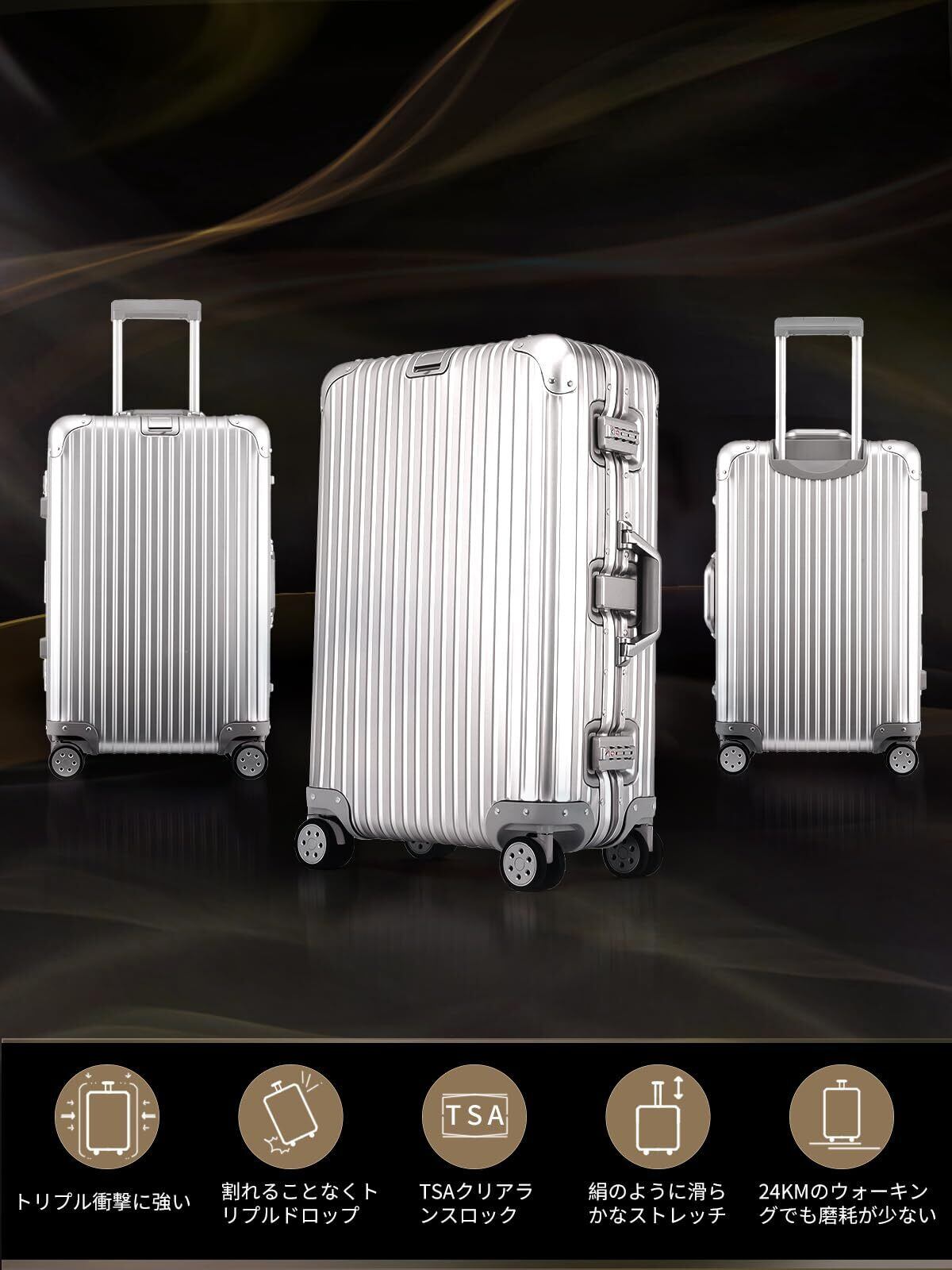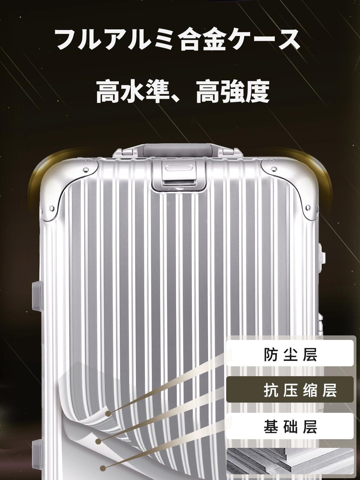 【アルミ・マグネシウム合金ボディ+アルミフレーム】スーツケースは高強度アルミ・マグネシウム合金ボディとアルミフレームを採用し、外観はファッショナブルでクール、高級感があり、市場のABS素材を使用した製品よりも丈夫で軽く、耐傷性、耐摩耗性、耐衝撃性に優れ、衝突を恐れず、安全性が高く、耐用年数が長い。
