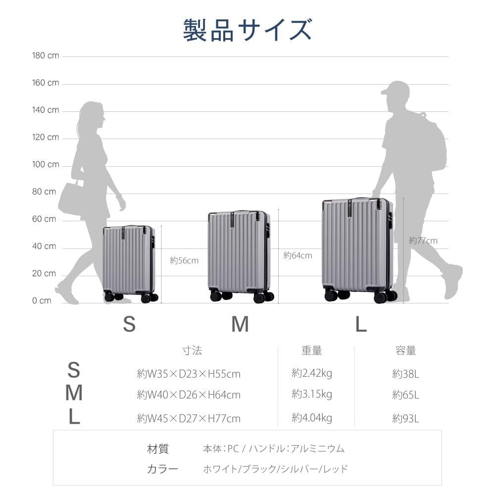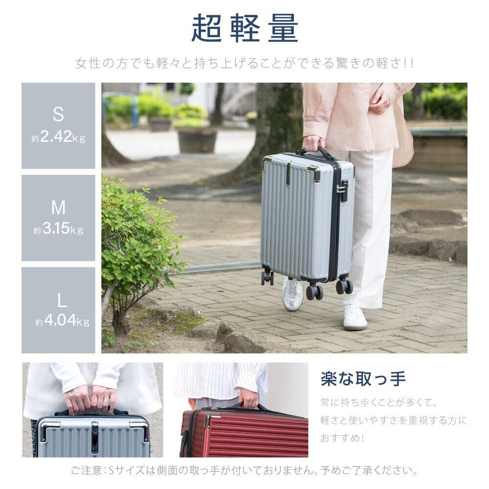 【軽量設計で持ち運び便利】PCとABS樹脂を使用した超軽量キャリーケース。Sサイズは約2.42kg、Mサイズは約3.15kg、Lサイズは約4.04kgで、女性でも楽々と持ち運びが可能です。日常の旅行やビジネス出張に最適です。