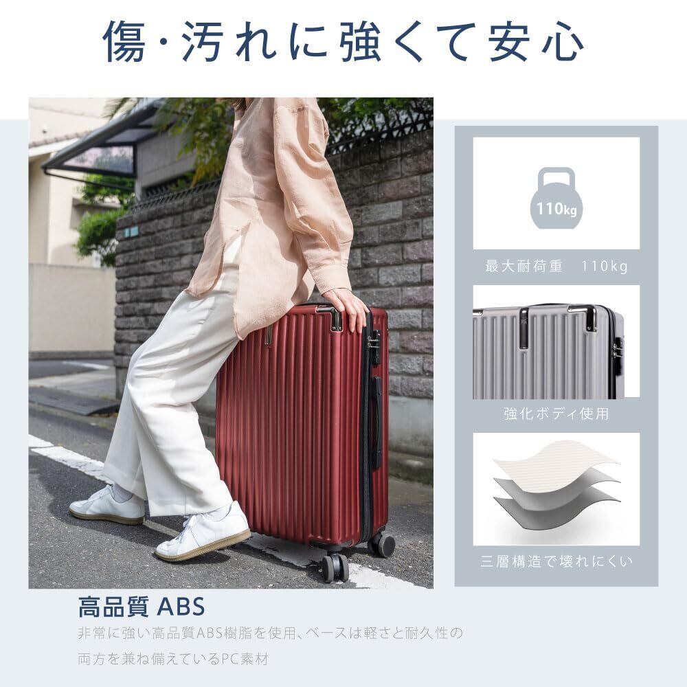 【高品質なボディ】ABS+PC樹脂のボディは、耐久性と耐衝撃性に優れ、軽量でありながら非常に頑丈です。傷がつきにくく、長期間の使用にも耐えられるため、安心してご利用いただけます。また、多段階調節キャリーバーを採用しており、ワンタッチで調節でき、身長に合わせて使えます。Sサイズは2段階調節、M/Lサイズは1段階調節が可能です。このように、高品質な素材と便利な機能を兼ね備えたスーツケースです。