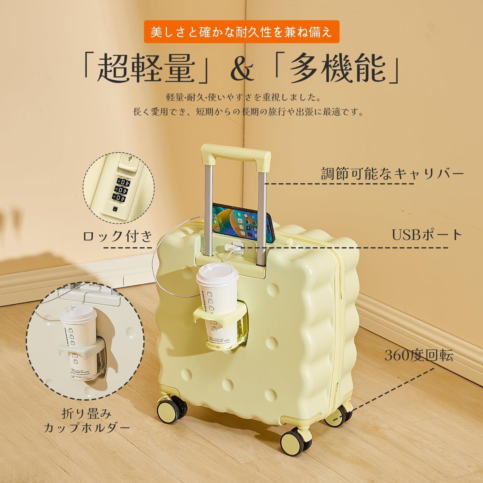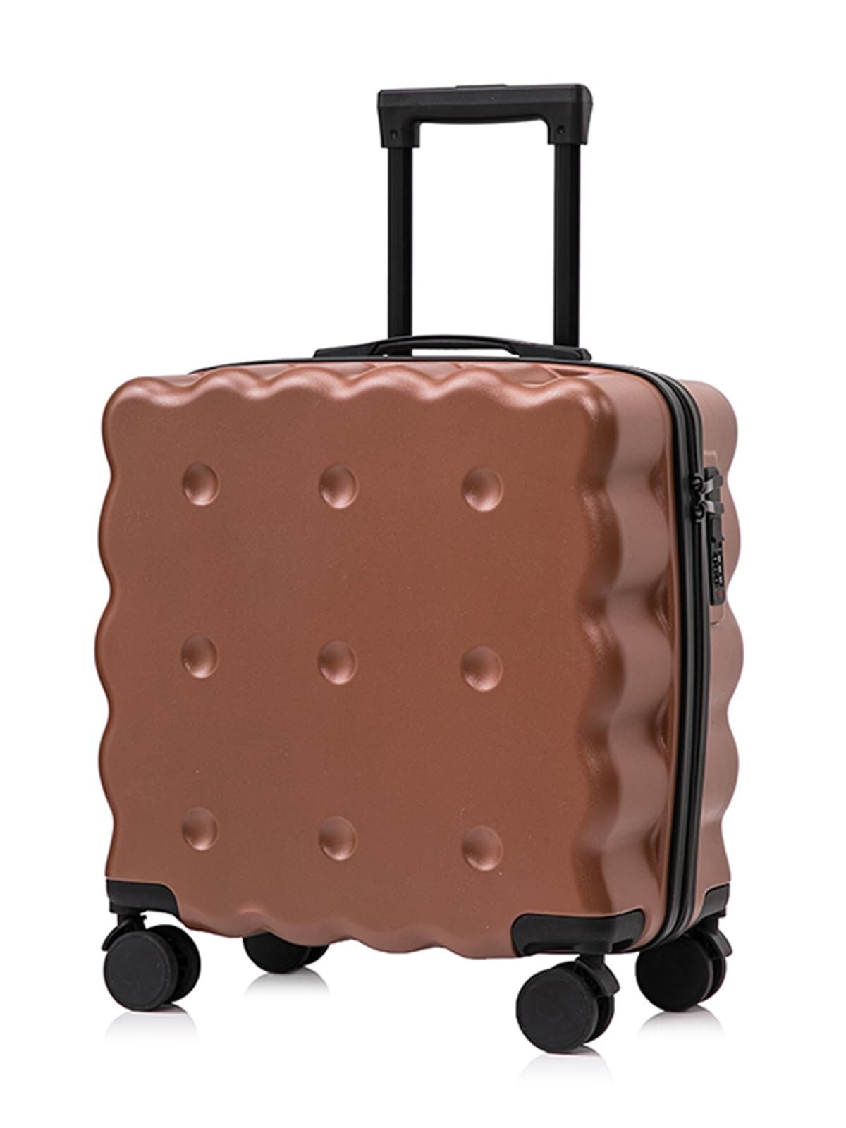【超かわいいビスケット】本体シェル素材にPCを採用した、軽量かつ耐久性のあるかわいいビスケット様なのスーツケースです。創意があるビスケットような形にスムーズな動きを出してくれるダブルホイールが特徴的です。スムーズな走行と、あなたの旅を心地よくサポートします。内部にはファスナー付きの仕切りがあり、中身が飛びさないようになっているので安心です。