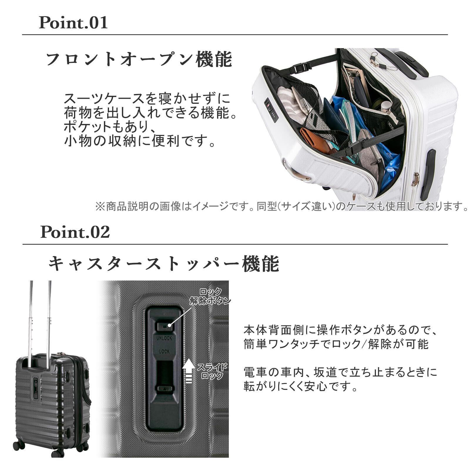 本体を開けずに簡単に荷物を取り出せるフロントオープン機能を搭載したスーツケースです。