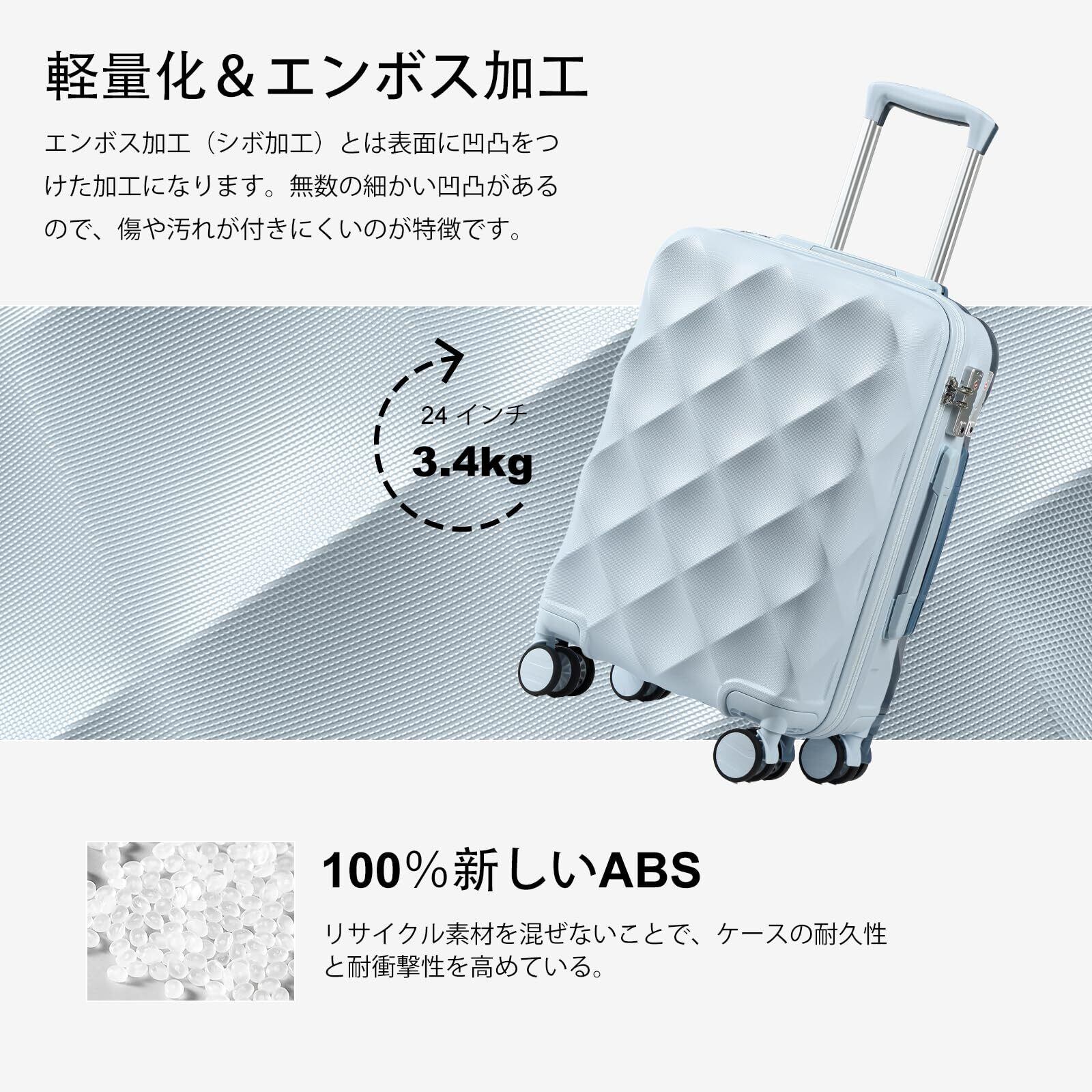 『高耐衝撃性表面素材』キャリーケースのボディには軽量で強固性に優れた「ABS素材」を採用して、耐久性と軽さを両立してます。ボディ表面に細やかな凹凸をつけた加工は、キズ·汚れがつきにくく、目立ちにくい特性も持っています。シンプルかつファッションです。超軽量で携帯便利、女性でも楽々に持ち出かける人気なスーツケースです。