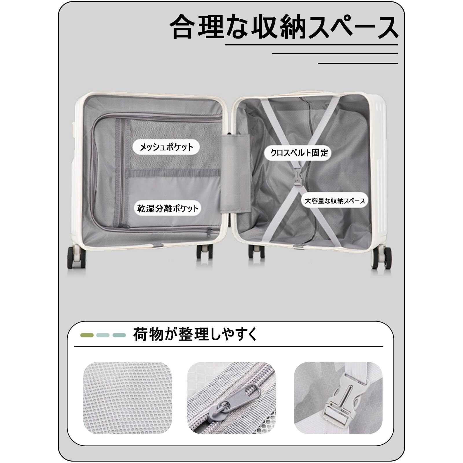 収納スペース≫○フロントファスナーポケット1個、メッシュポケット1個、乾湿分離ポケット1個、ファスナー付きメイン収納1個、クロスベルト固定メイン収納1個。荷物の整理がしやすく、スーツケースを開くことなくものの取り出すことができます。出張や資料の持ち運びなどビジネス用途から旅行まで、色々な場面で活躍できます。