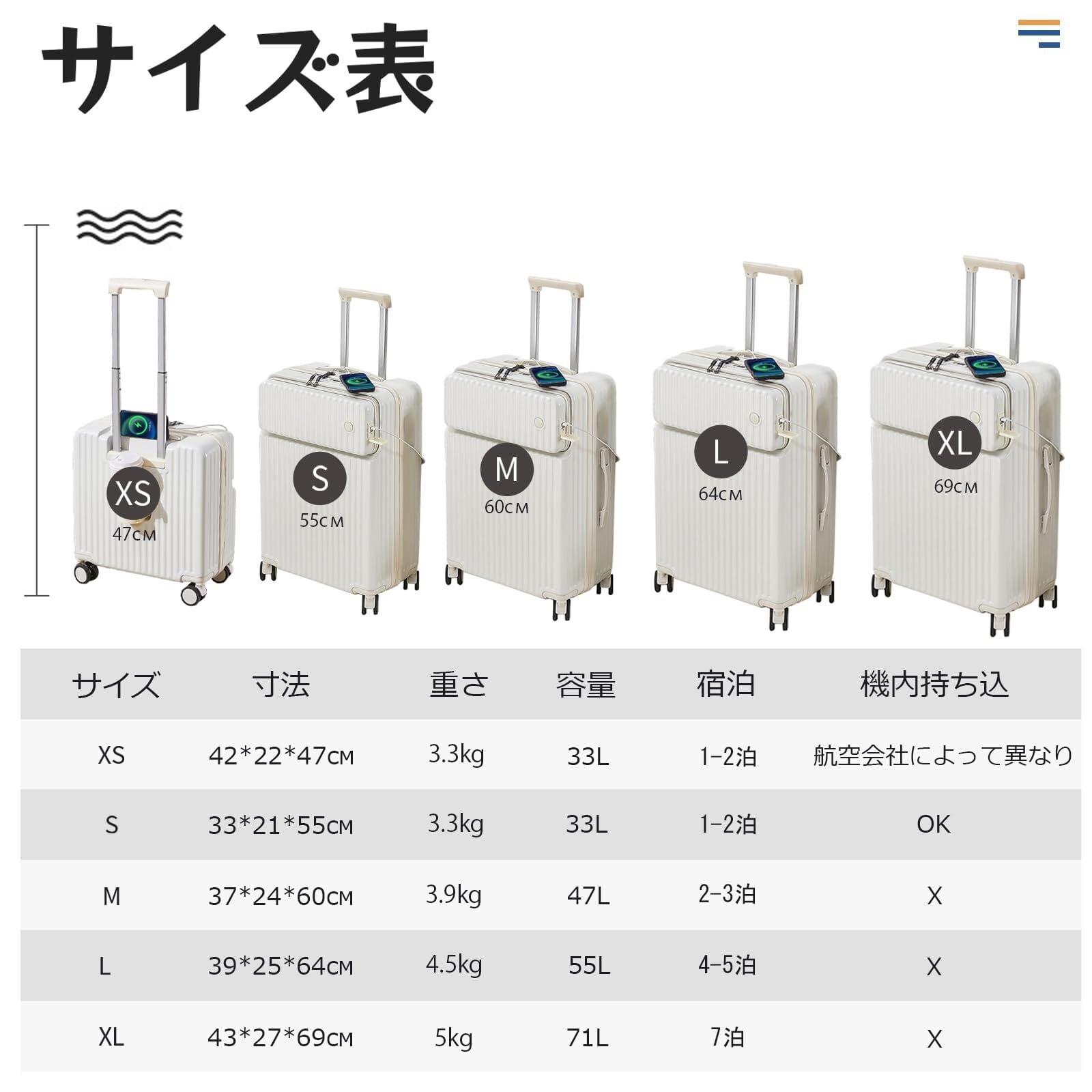 便利で使いやすい≫○USBポートを搭載しているため、スーツケースを開けることなく充電しながら持ち運び可能。○サイドフックやカップホルダーが搭載され、ドリンク、傘、バッグなどを配置でき、手への負担を軽減し、旅行を楽しむ!注意事項≫XSとSサイズは小さいため、側面の持ち手とサイドフックがキャンセルされました。