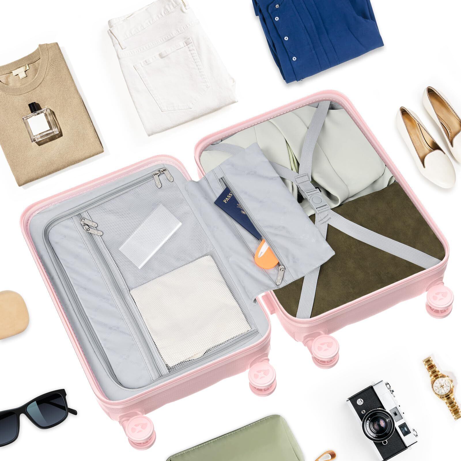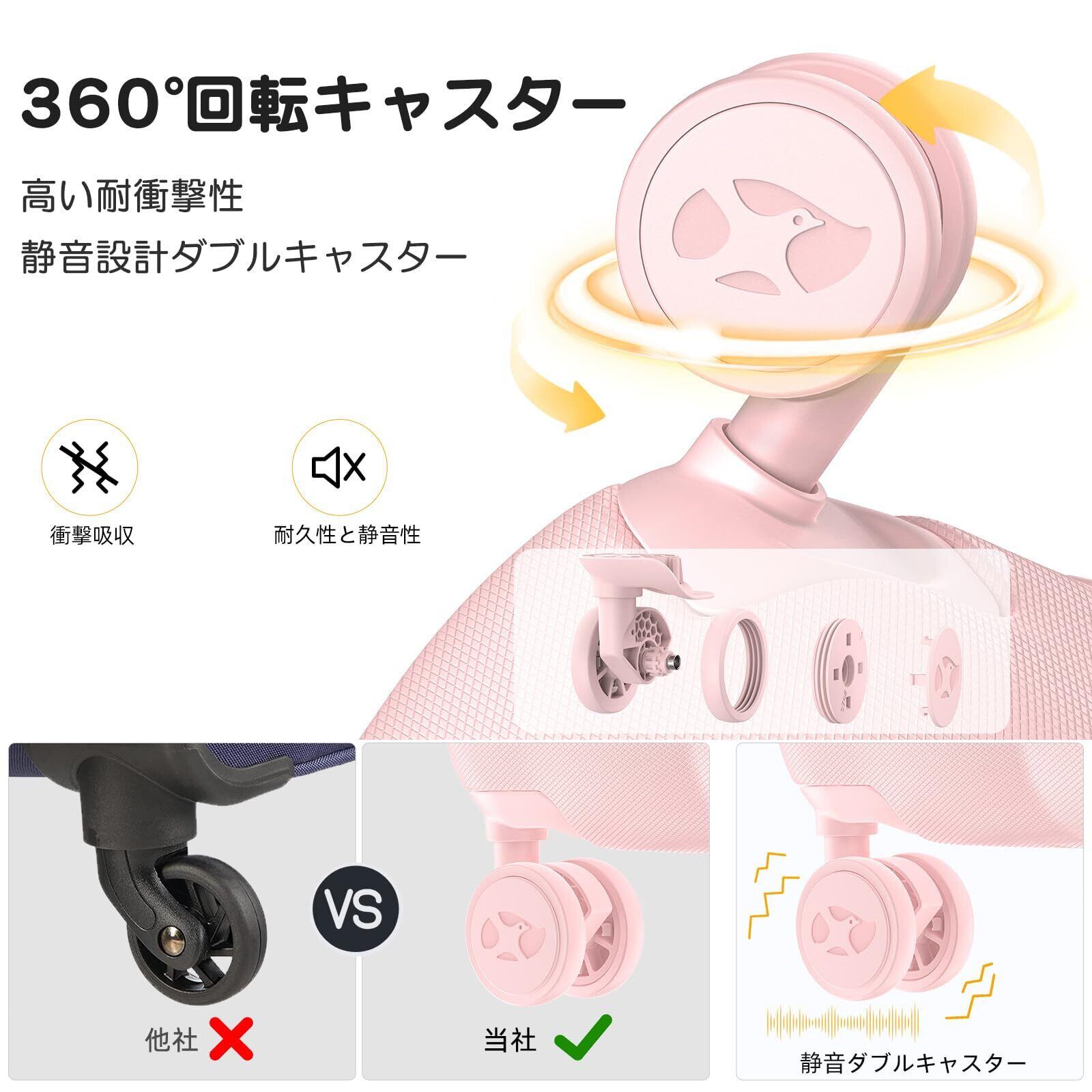 【耐衝撃静音ダブルキャスター】8輪ダブルキャスターはスーツケースの底面四隅に車輪を備え、ケースを斜めにしても立てたままでも移動させることができます。さらに、スーツケースに360度自在走行できるダブルホイールが付けられており、キャスターの操作性と耐久性が抜群で超静音、深夜や朝早いに使っても周りの人に迷惑をかけません。静音設計と耐久性抜群のキャスターで、凸凹路面で、重い荷物でもスムーズで安定した走りを可能に。X型ベルトが搭載され、荷物崩れを完全防止。