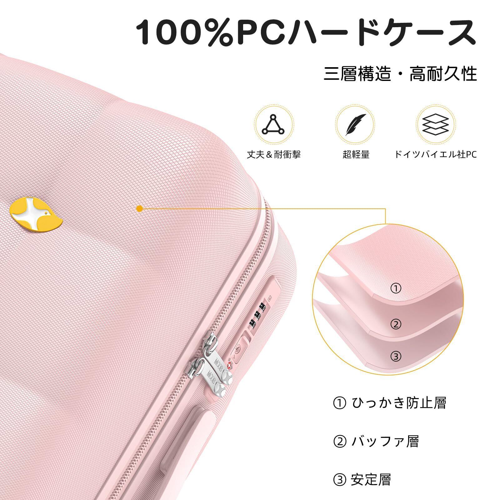 【新登場・ドイツ名社BAYER PCを100%使用】ボディ素材はPC+ABSから値段より高いピュアPCにアップグレードしました。100%ボディを備えたスーツケースです。PC(ポリカーボネート)は耐衝撃性、耐摩耗性、防水性、耐熱性、抗菌性に優れるエコ素材です。ABSを捨て去って、耐衝撃性が倍加の同時に、軽さも驚くほどになりました。スーツケースの場合、PC>PC+ABS>ABSです。外見にはPC+ABS素材のスーツケースとよく似ていますが、品質は違います!また、蜂の巣状のスクラッチ防止パターンを採用しているため、本来立体的なデザインに立体感を持たせるとともに、ボディーのスクラッチ防止特性を向上させています。美観と実用性を併せ持ち、バッグの耐摩耗性がより向上され、もっと頑丈になります。