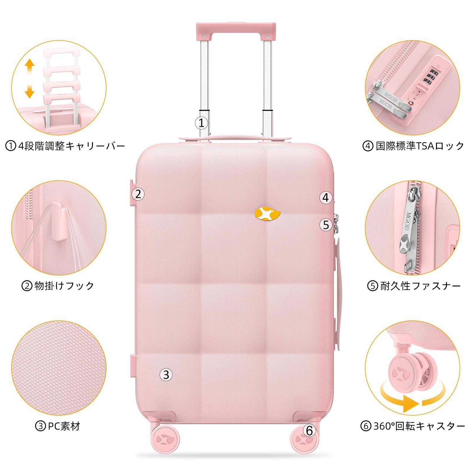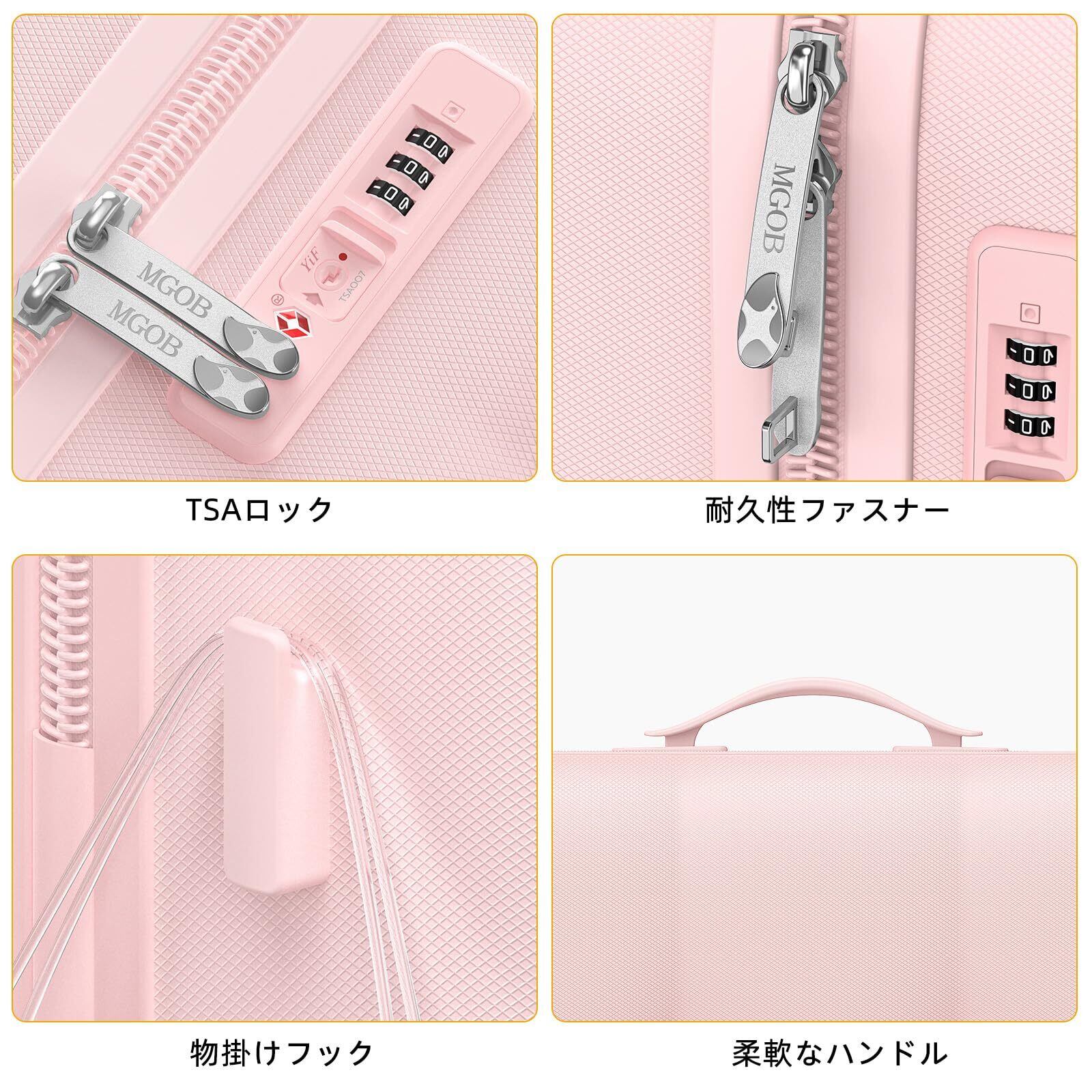 [MGOB] キャリーケース スーツケース 機内持ち込み キャリーバッグ 可愛い 超軽量 フック機能 耐衝撃 静音 ダブルキャスター TSAロック ファスナータイプ 旅行 ビジネス 出張(ピンク, Mサイズ 80L/5~10泊向き)