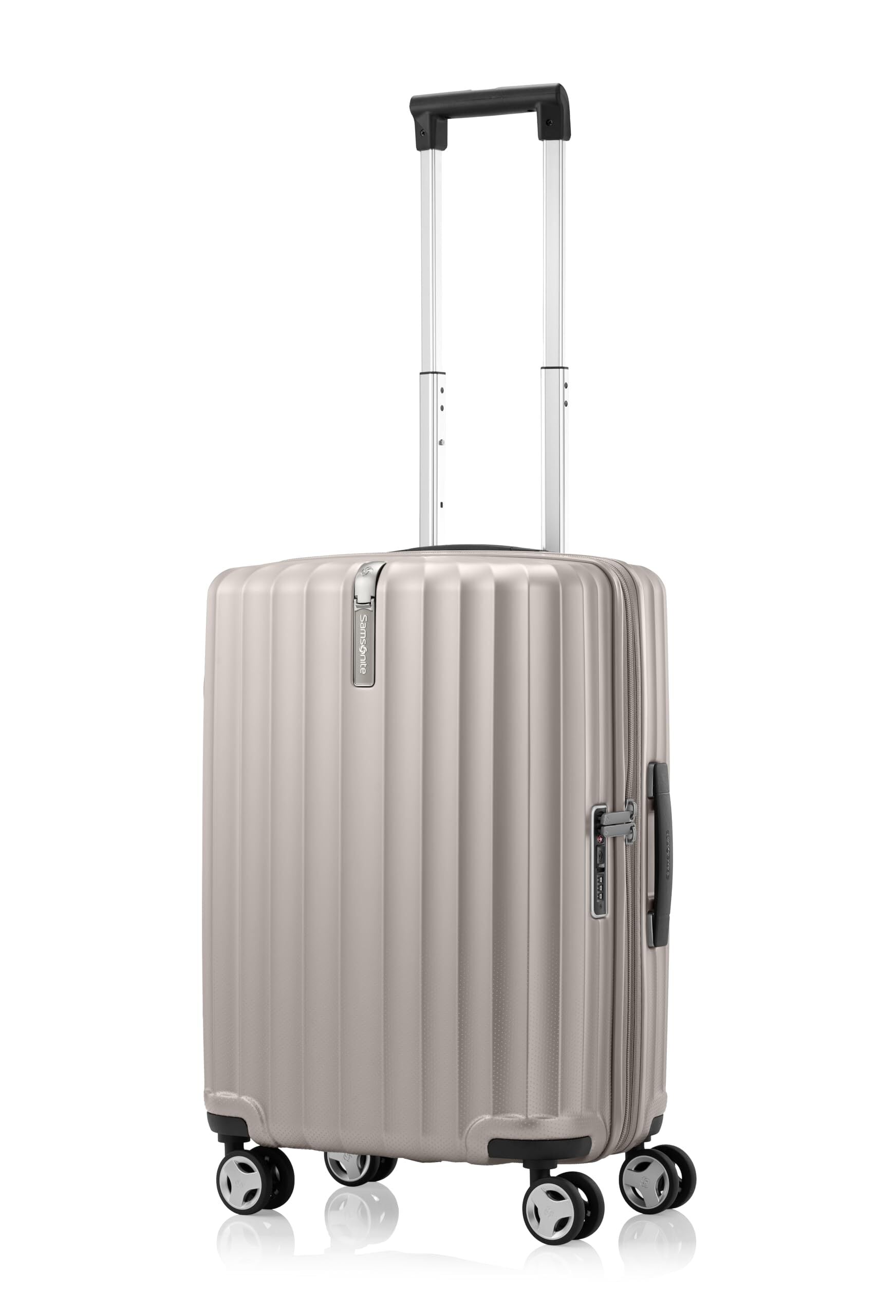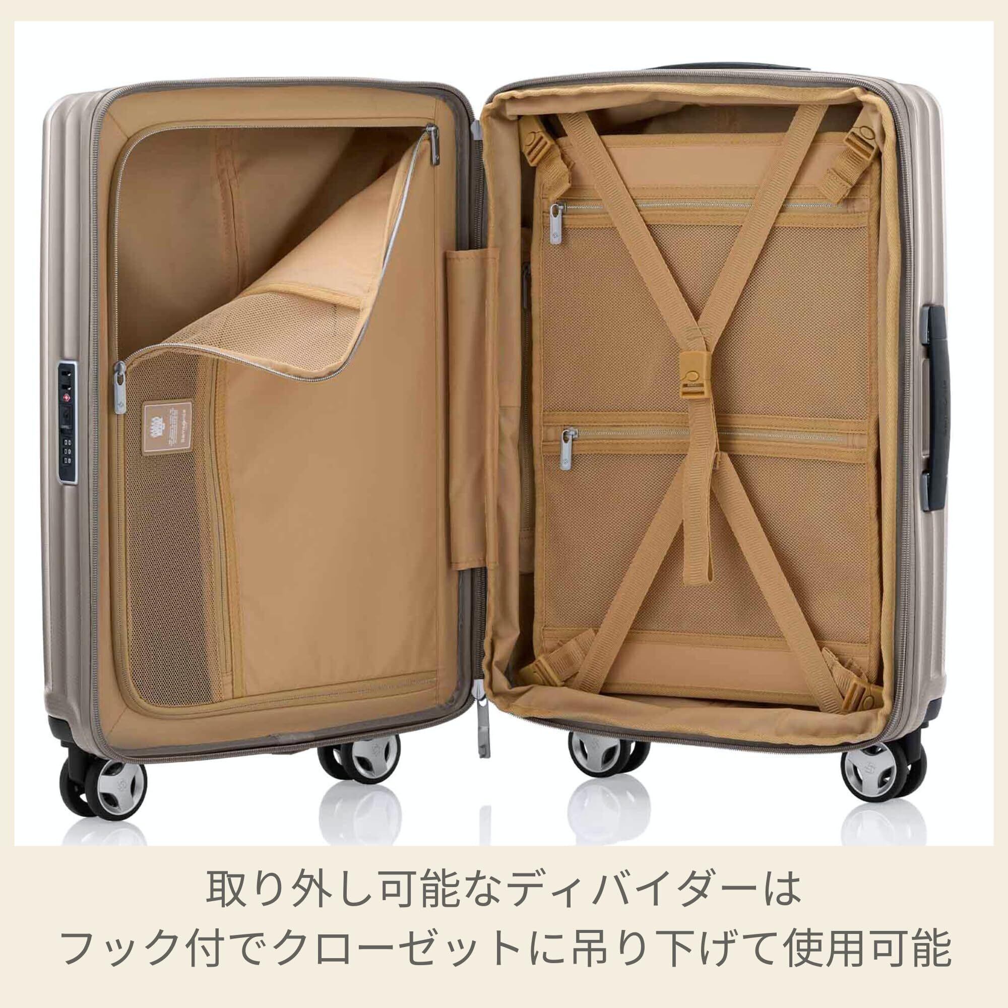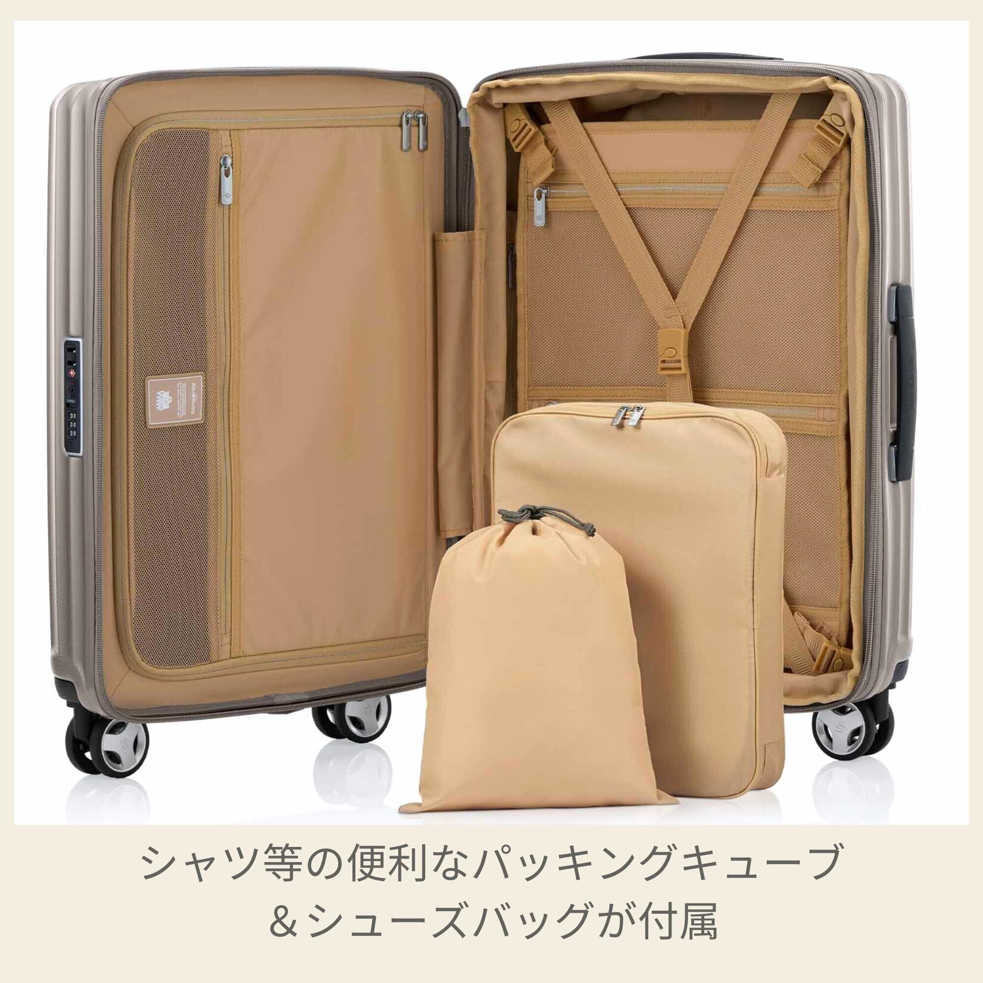 モダンでタイムレスなデザイン、プレミアムな外観。ケースのトップから下に向かって放射線状に流れるグルーヴが美しい、ラインで形成された優美でミニマルなデザインが特徴です。シャツなどの収納に便利なパッキングキューブ、替えのシューズなどに便利なシューズバッグが付属します。