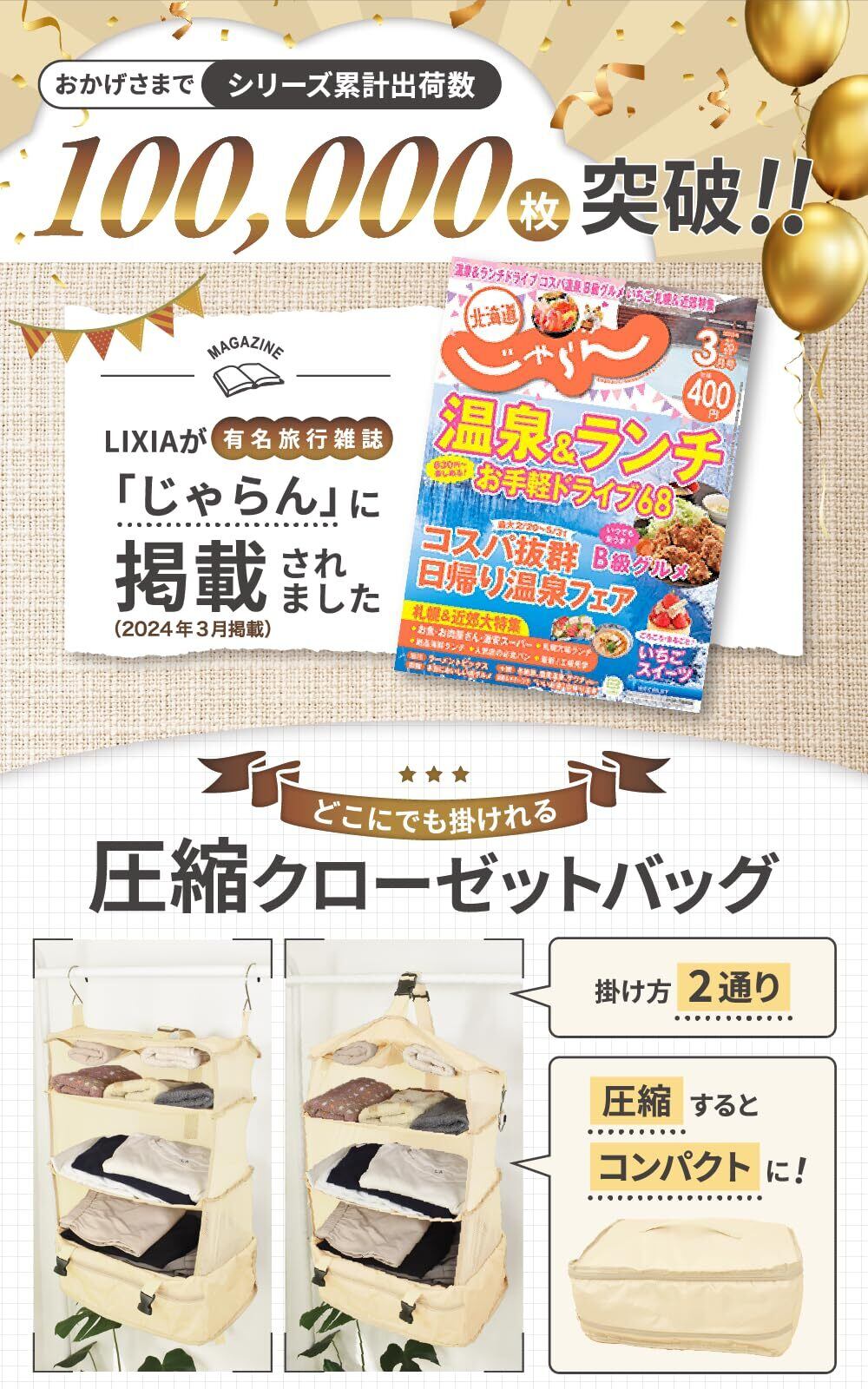 LIXIAから吊り下げ型トラベルポーチが新発売 掛け方2通り、圧縮方法も2通り! お好みに合わせて様々なカスタマイズが可能な持ち運び式衣類収納バッグです。