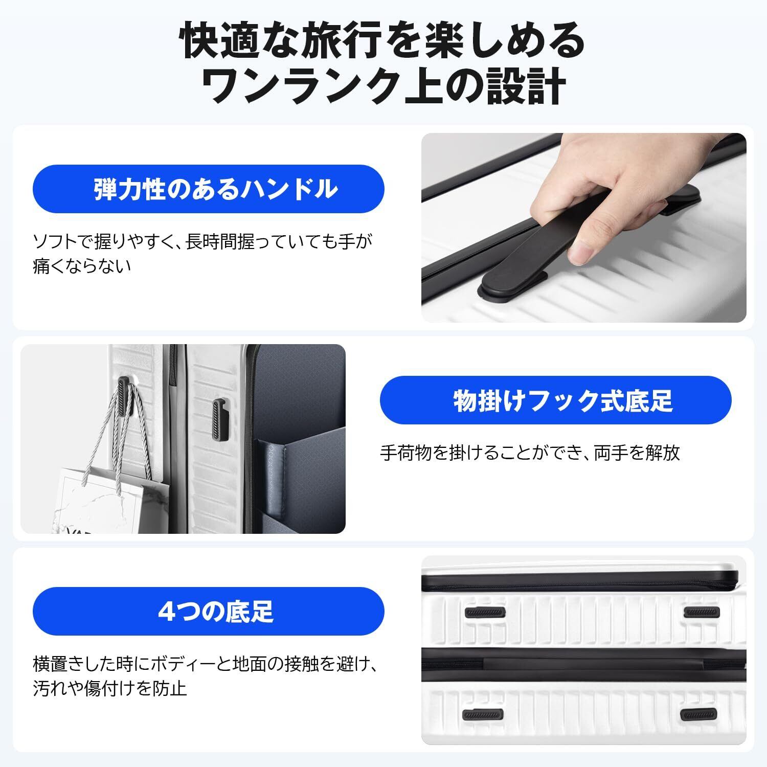 【便利なフロントオープン設計】スーツケースは便利なフロントオープンポケットを搭載し、パソコンやタブレット、パスポートなどの荷物を立てたまま簡単に取り出すことができます。便利なUSB充電ポート付きで、場所を選ばずいつでもどこでも移動しながら効率よく充電ができ、より快適な旅行を楽しめます。