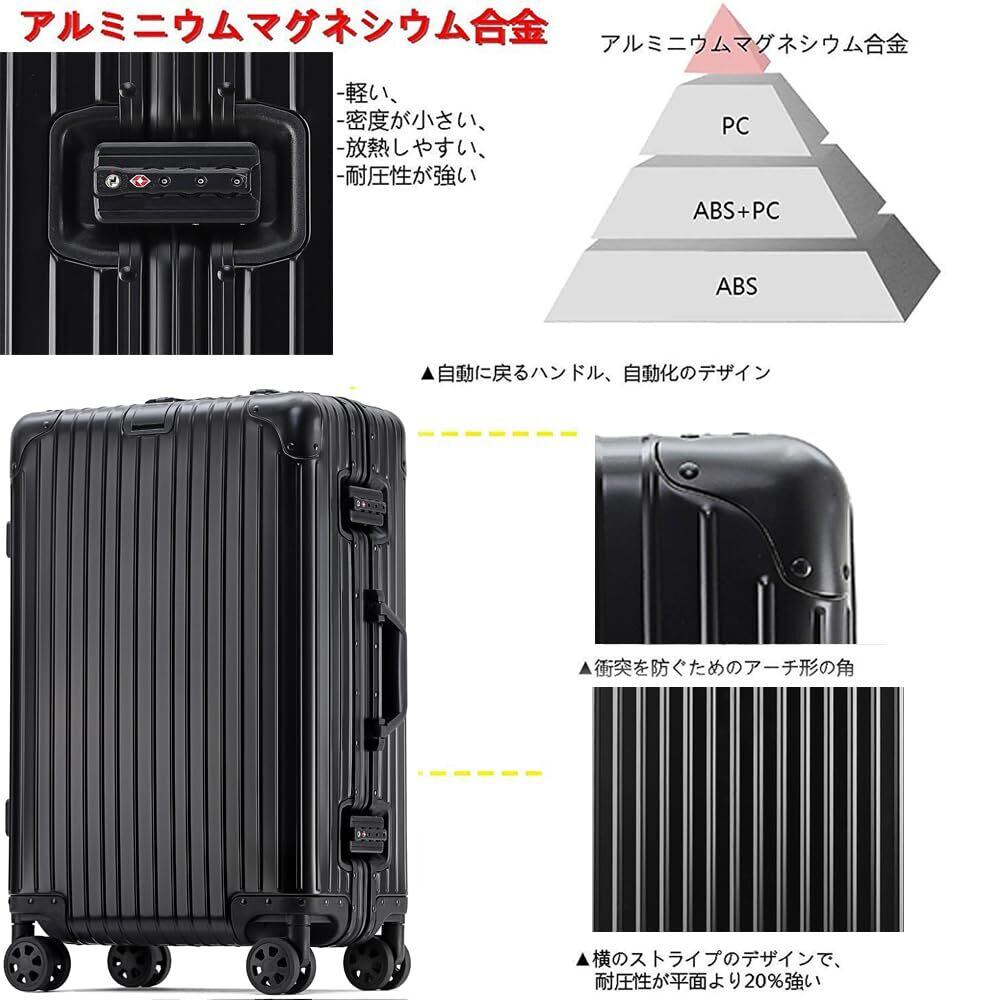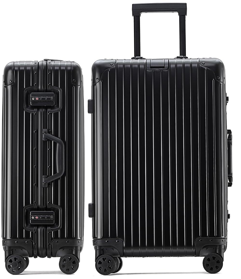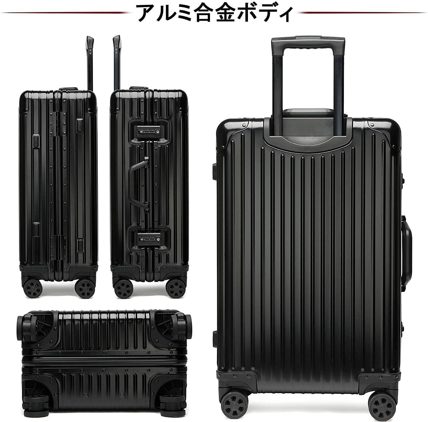 【素材】キャリーケースの材質は オールアルミ合金ボディ+アルミフレーム。特にアルミボディが洗練されたイメージでcool。メタル素材ゆえに強度は折り紙付き。長持ちできます。メタリックボディでルックスも美しく、見た目の高質感があるのもいいところ。コーナーにもプロテクターがつきまして、衝撃に防ぎます。