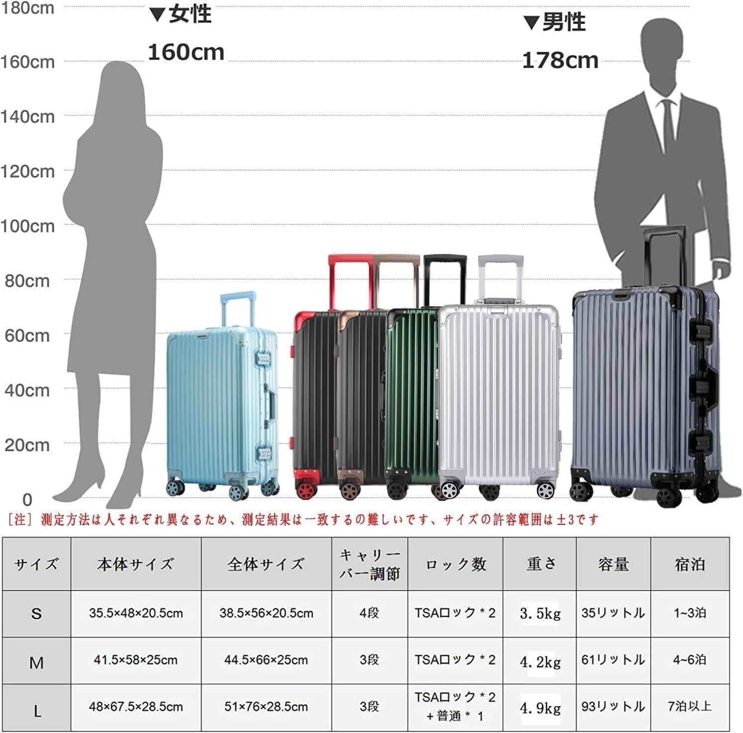 【サイズ】Sサイズの内寸は48*35.5*20.5cm、容量は35リットル、1~3泊に似合います。Sサイズは一部の航空会社だけに適用しますので、事前に航空会社に確認したほうがいいんです。Mサイズの内寸は58*41.5*25cm、容量は60リットル、4-7泊以上。Lサイズの内寸は48*67.5*28.5cm、容量は93リットル、7泊以上。