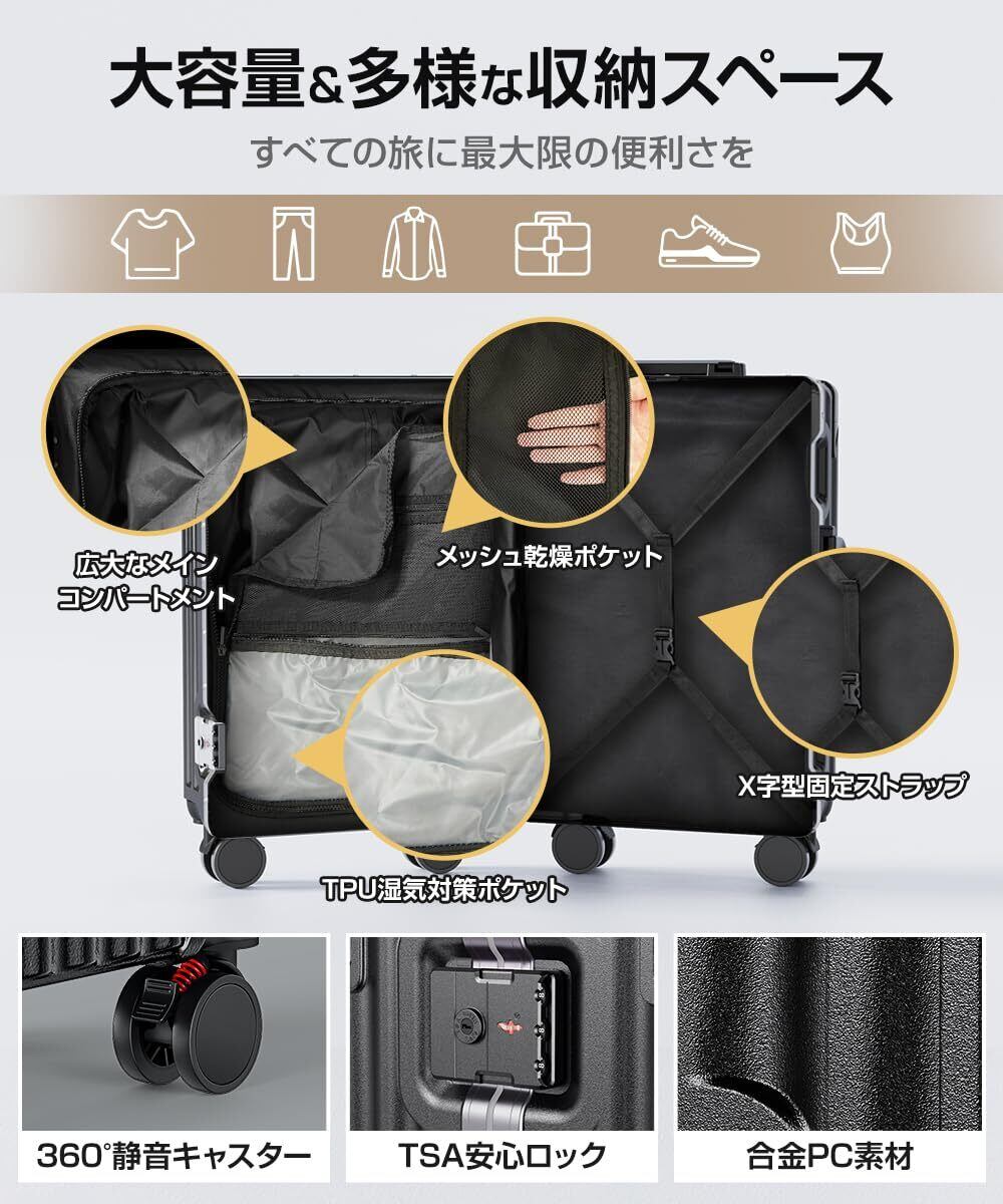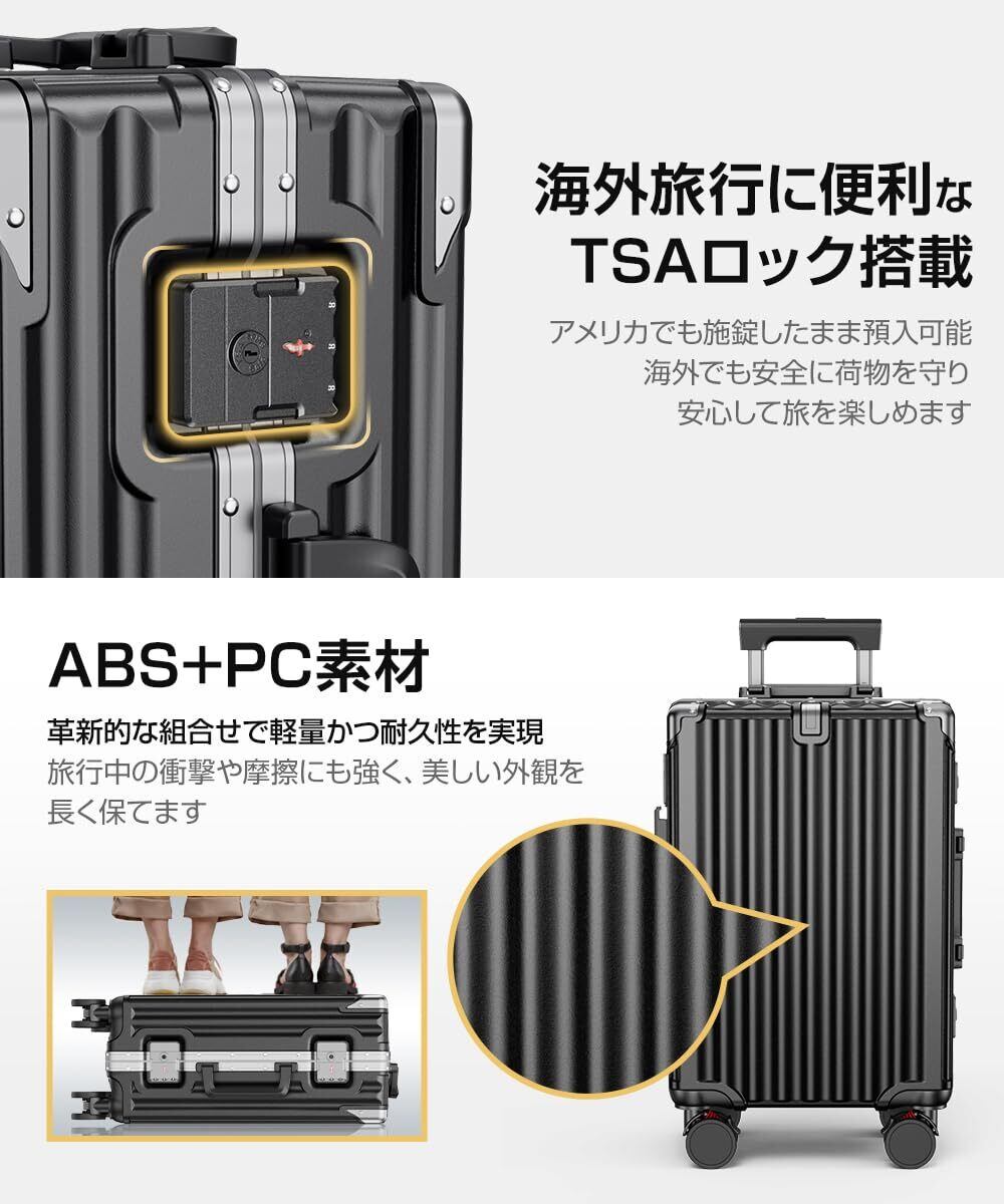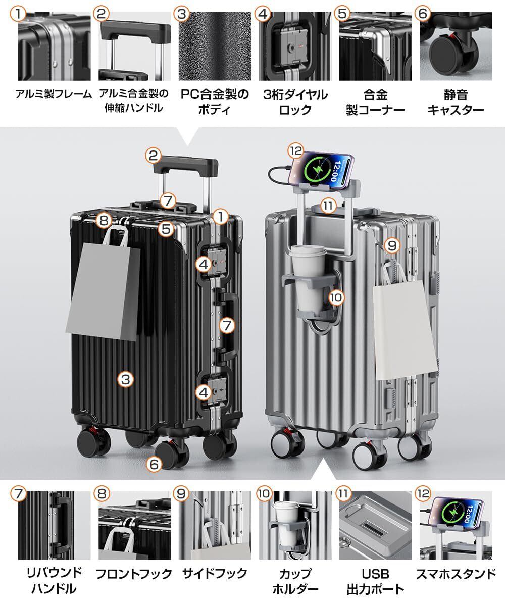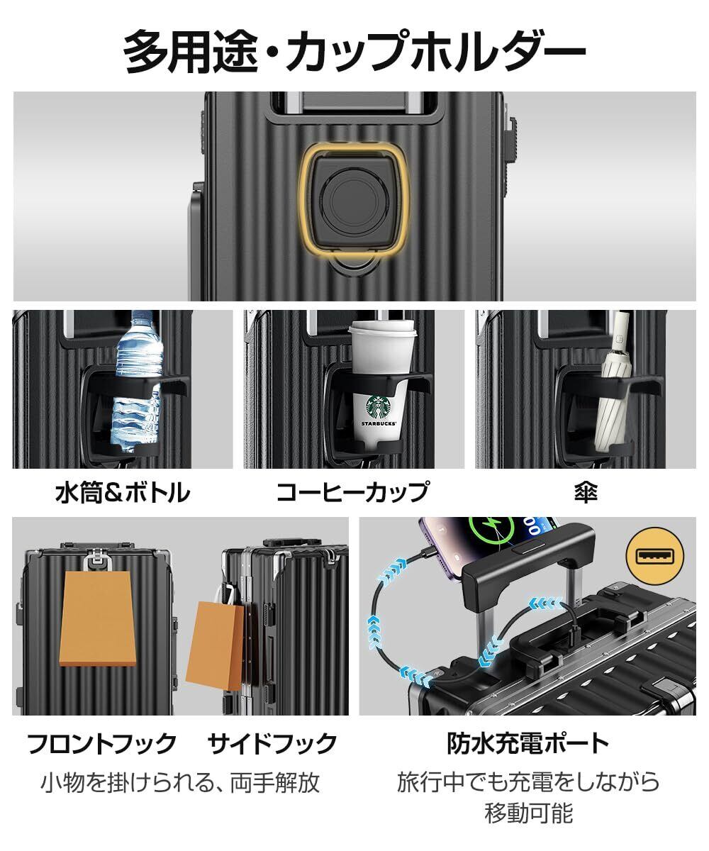 [Ullnoy] スーツケース 機内持ち込み キャリーケース 『便利機能付き・大容量&頑丈』 アルミフレームタイプ ストッパー付き USBポート&カップホルダー付き 隠しフック機能 キャリー ケース 軽量 耐衝撃 静音 大型 360度回転キャスター キャリーバッグ 旅行 ビジネス 出張
