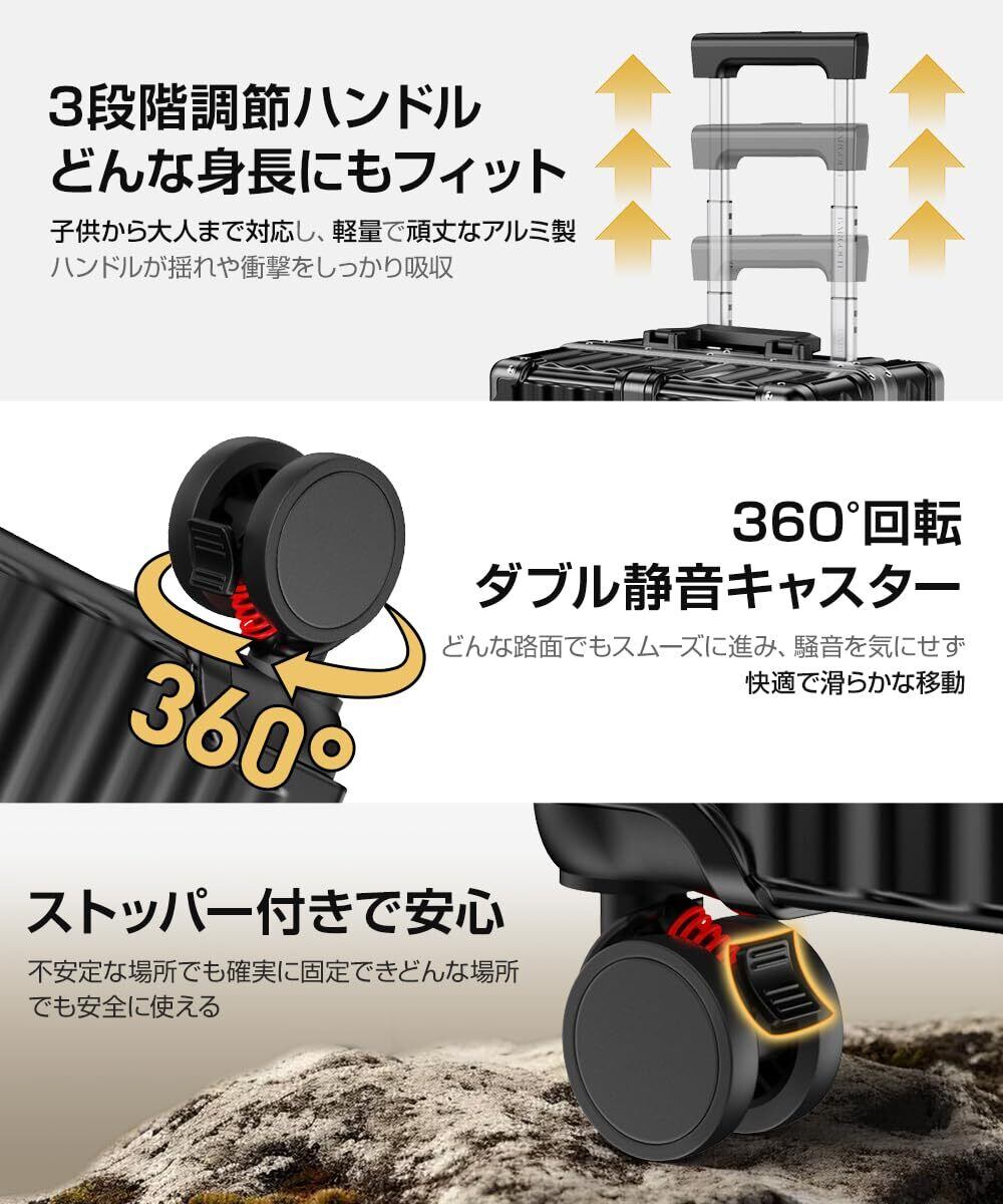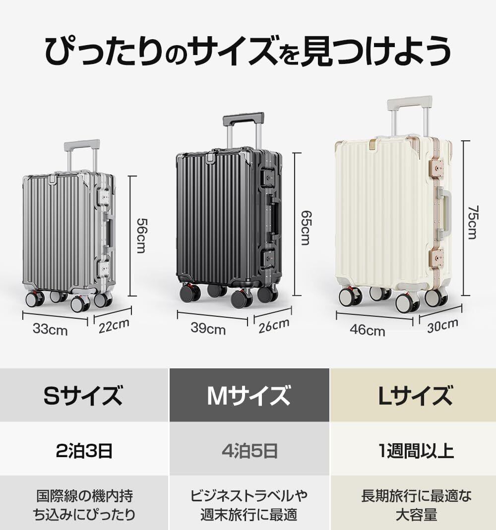 【TSAロック搭載・海外旅行も安心】 スーツケース TSAロックを標準装備しているため、海外旅行でも施錠したまま安心して預けることができます。アメリカ旅行にも対応し、セキュリティ面で優れた保護性能を発揮。海外での移動や出張の際も安心してご利用いただけます。【3段階調節ハンドル&360°静音キャスター】 スーツケース の3段階に調節可能なハンドルは、子供から大人までどんな身長の方にもフィットします。 スーツケース 軽量 で頑丈なアルミ製ハンドルは、揺れや衝撃を吸収し、長時間の移動も疲れを感じさせません。また、360°静音キャスターにより、どんな路面でもスムーズに移動でき、騒音を気にせず快適で滑らかな移動が可能です。