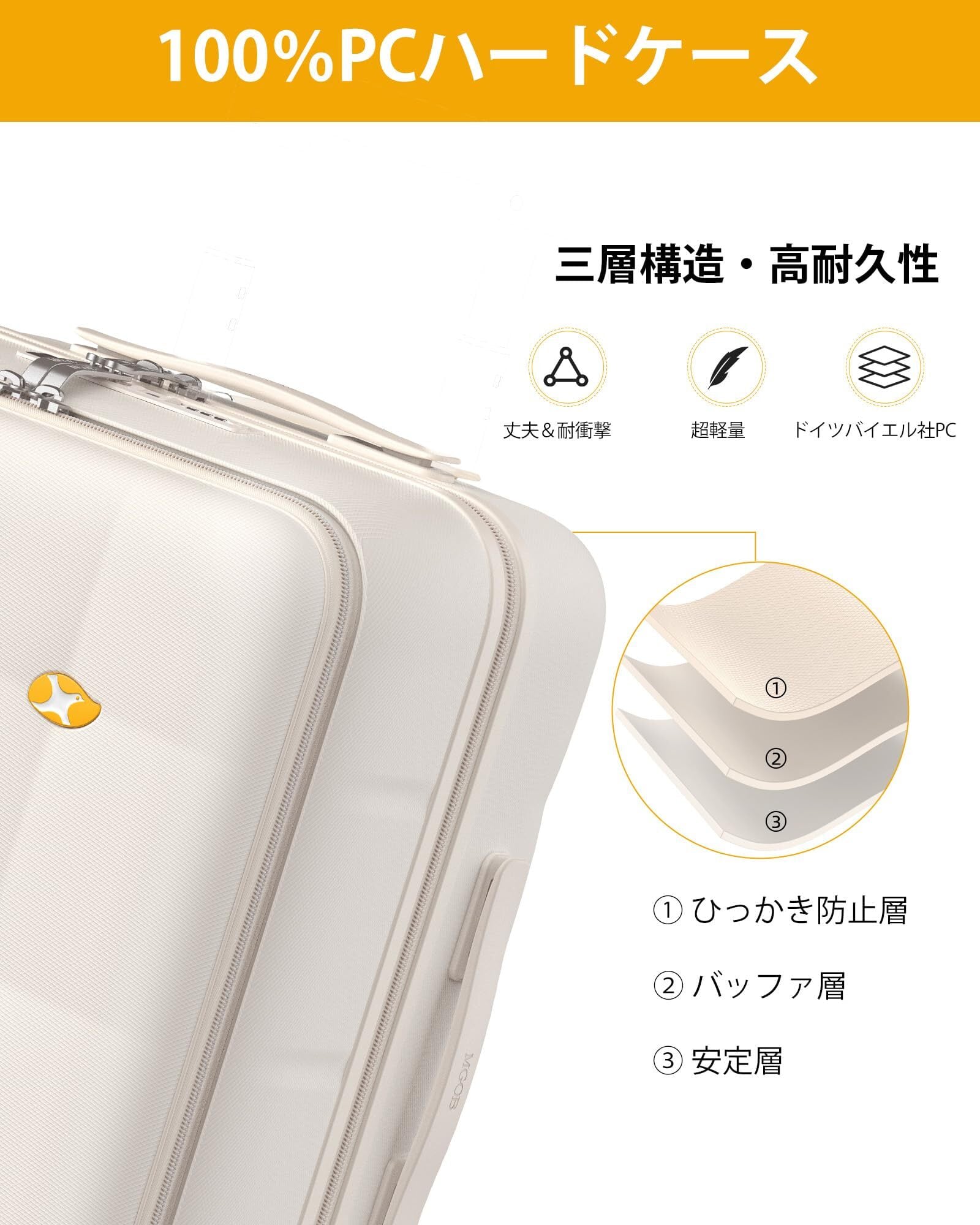 【新登場・ドイツ名社BAYER PCを100%使用】ボディ素材はPC+ABSから値段より高いピュアPCにアップグレードしました。100%ボディを備えたスーツケースです。PC(ポリカーボネート)は耐衝撃性、耐摩耗性、防水性、耐熱性、抗菌性に優れるエコ素材です。ABSを捨て去って、耐衝撃性が倍加の同時に、軽さも驚くほどになりました。スーツケースの場合、PC>PC+ABS>ABSです。外見にはPC+ABS素材のスーツケースとよく似ていますが、品質は違います!また、蜂の巣状のスクラッチ防止パターンを採用しているため、本来立体的なデザインに立体感を持たせるとともに、ボディーのスクラッチ防止特性を向上させています。美観と実用性を併せ持ち、バッグの耐摩耗性がより向上され、もっと頑丈になります。