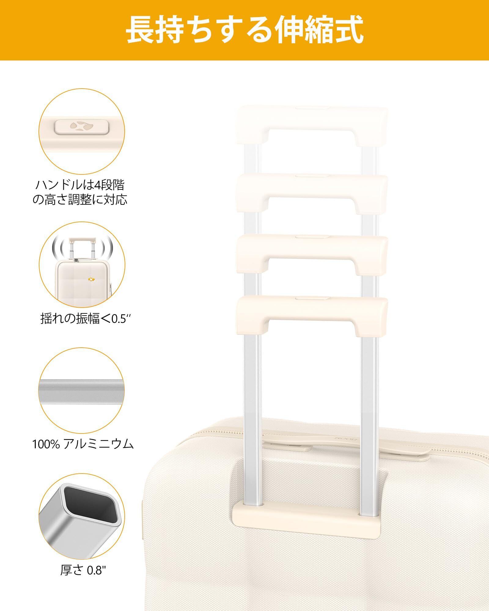 【4段階調整可能キャリーバー&フック機能搭載・収納力もプラス】アルミ合金キャリーバーが鉄製より軽くてサビにくく、4段階調整できるため身長に合わせた長さに調整でき、手に負担がかからず、長時間走行しても疲れません。また、物掛けフックが搭載されており、バッグなどを掛けて、旅行中の手への負担を軽減してくるスーツケース。仕切りと複数のポケットで整理整頓がしやすい内装レイアウト。たくさんの小物を入れることはできます。