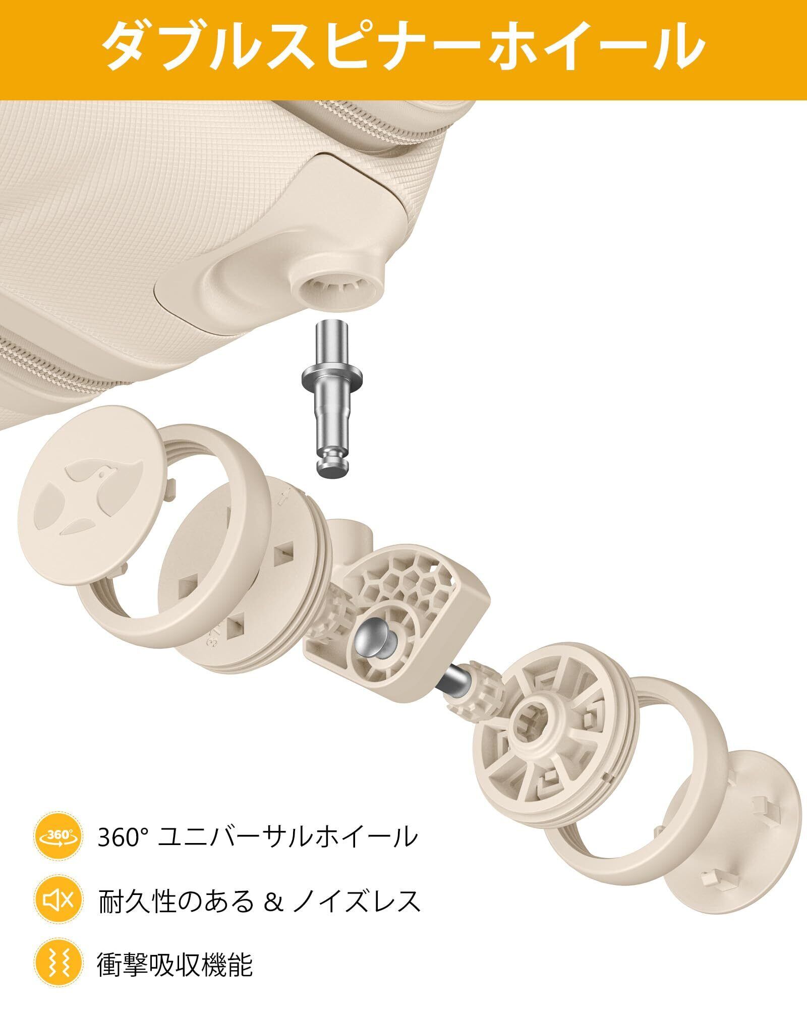 【耐衝撃静音ダブルキャスター】8輪ダブルキャスターはスーツケースの底面四隅に車輪を備え、ケースを斜めにしても立てたままでも移動させることができます。さらに、スーツケースに360度自在走行できるダブルホイールが付けられており、キャスターの操作性と耐久性が抜群で超静音、深夜や朝早いに使っても周りの人に迷惑をかけません。静音設計と耐久性抜群のキャスターで、凸凹路面で、重い荷物でもスムーズで安定した走りを可能に。X型ベルトが搭載され、荷物崩れを完全防止。