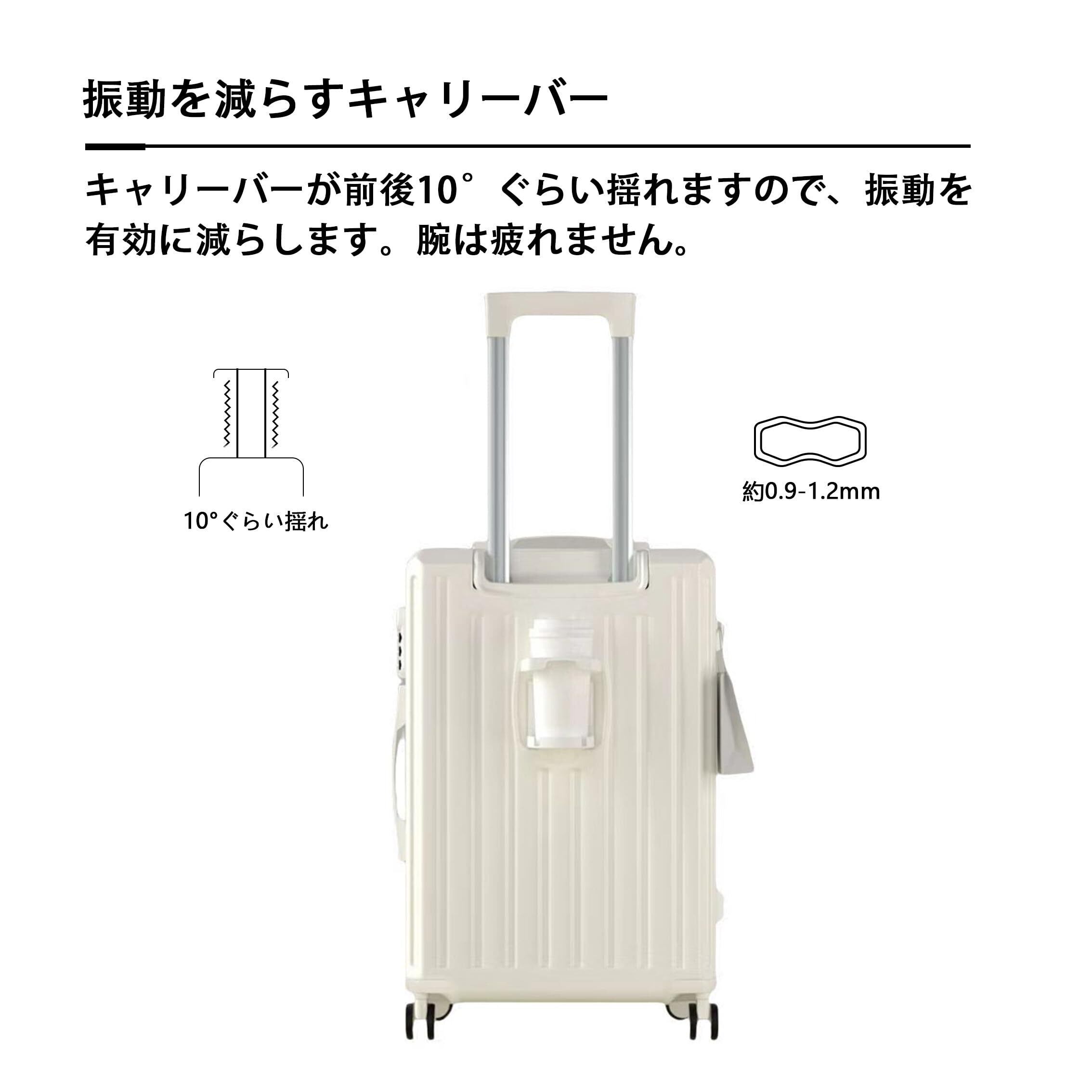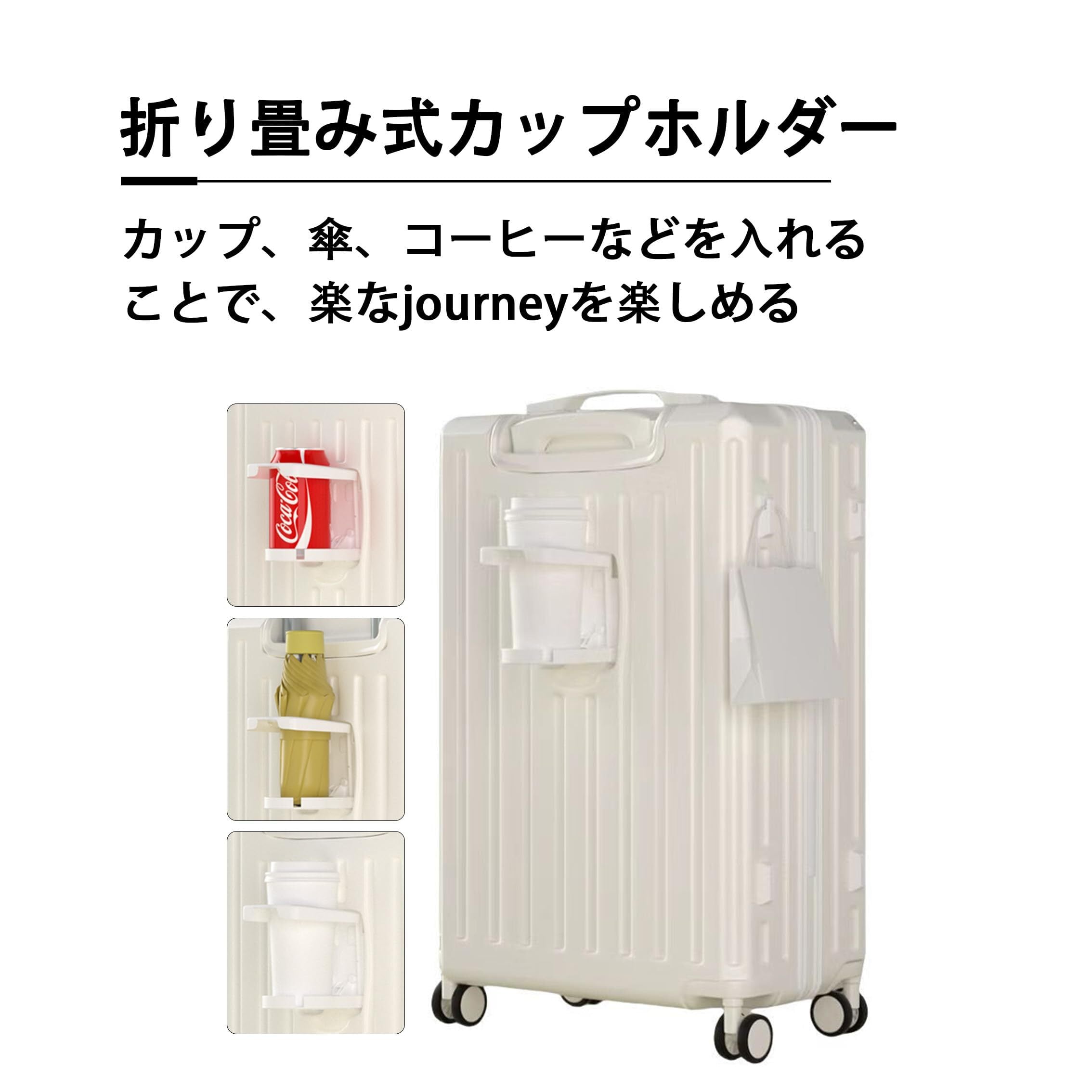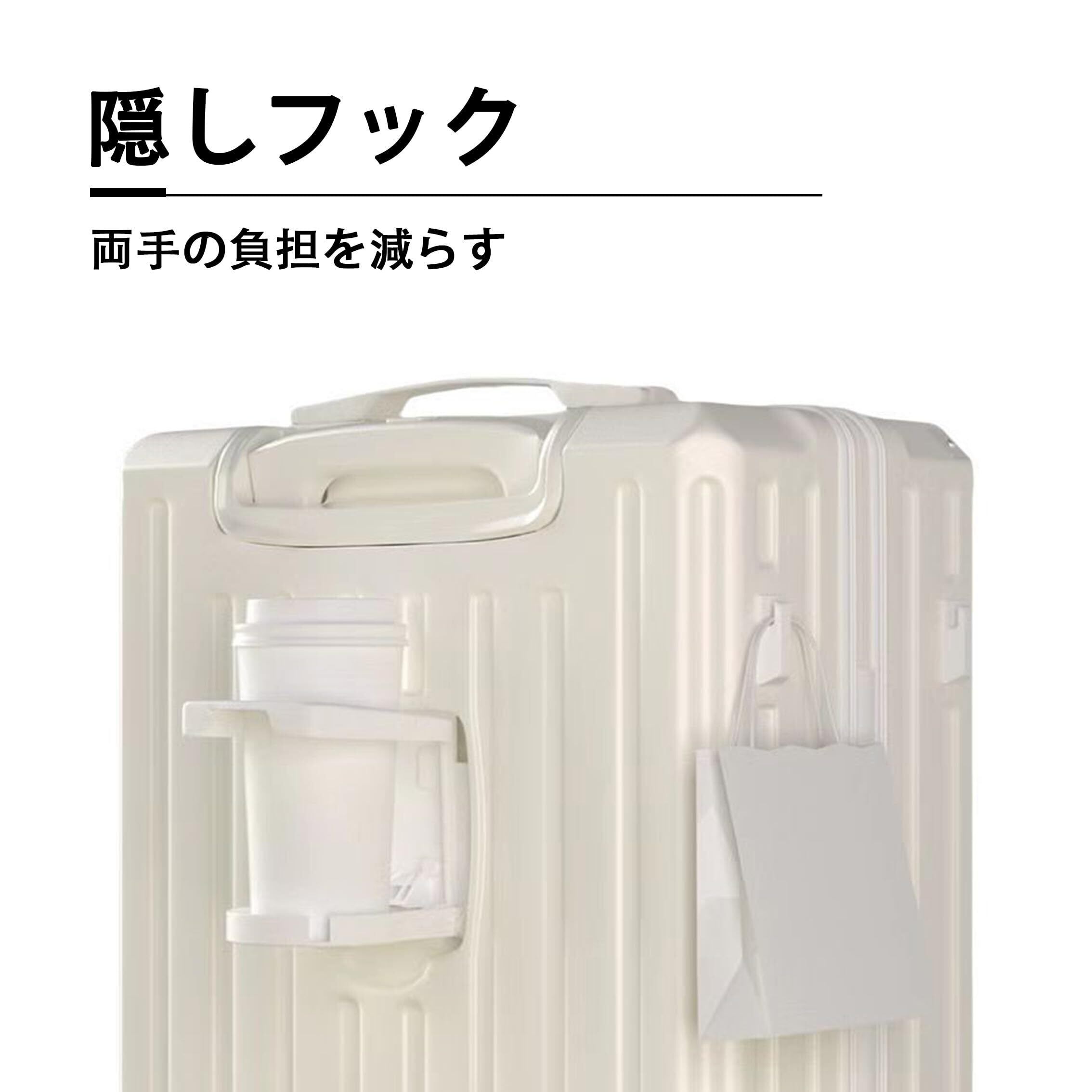 【折り畳み式カップホルダー】スーツケースには折り畳み式カップホルダーと隠しフックが装備しています。カップ、傘、コーヒーなどを入れることで、楽なjourneyを楽しめます。バッグや手提げ袋なども側面の隠しフックに掛けられます。更に手の負担を減らします。