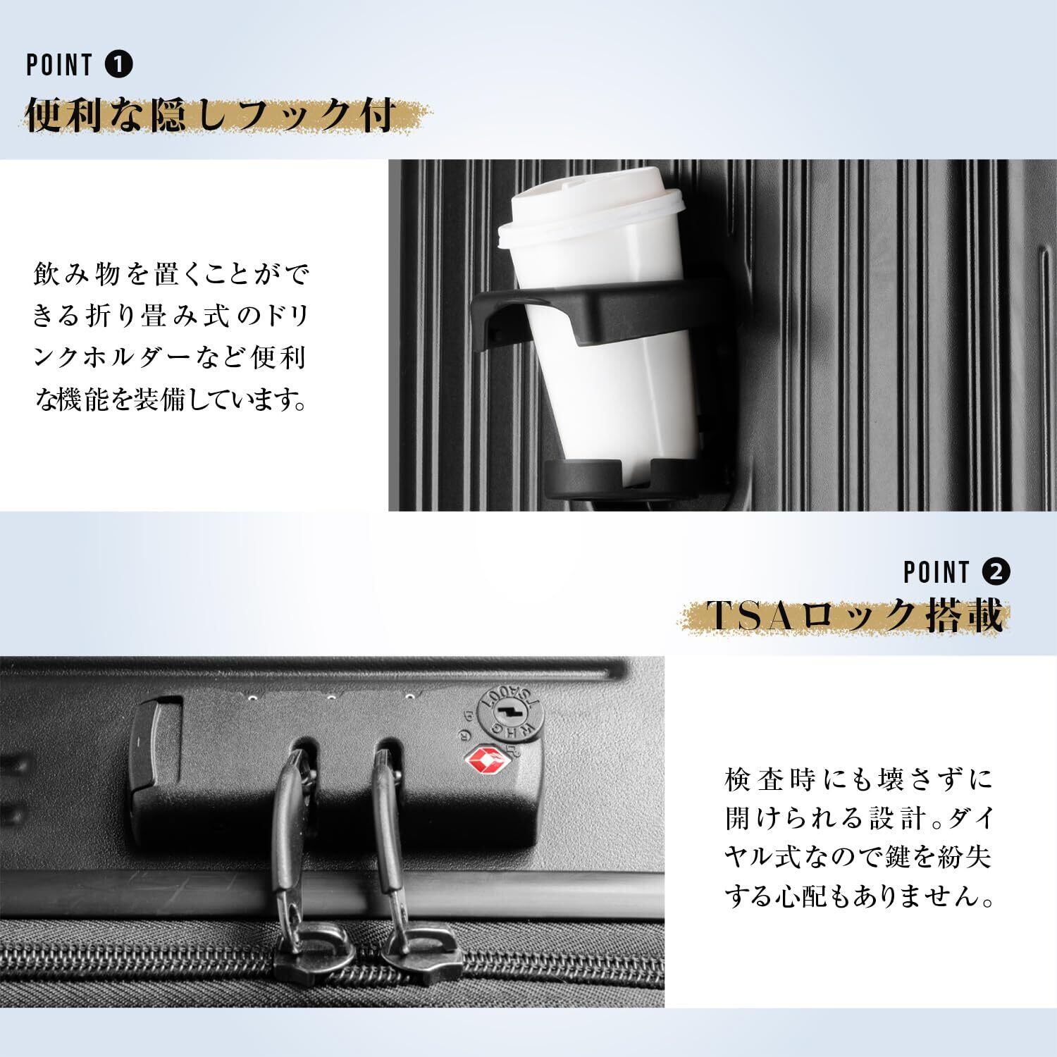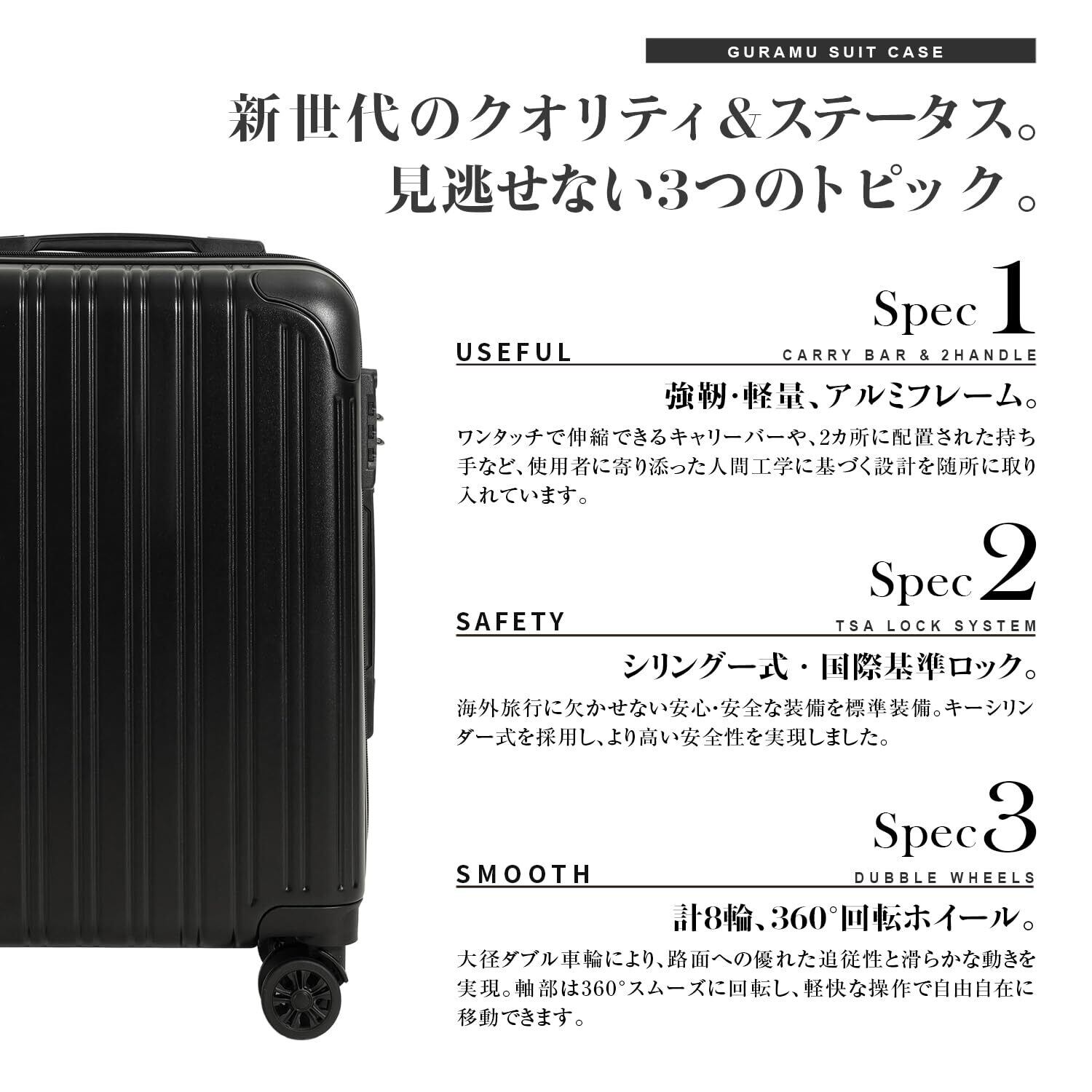 「軽量かつ耐久性に優れたスーツケース」 このスーツケースは、旅行やビジネス出張に最適な軽量で頑丈なデザインが特徴です。機内持ち込みにも対応しています。外側は高品質なポリカーボネート製で、耐衝撃性が高く、長期使用でも形を保ちます。 急な荷物の出し入れ時には、本体を開けることなく、フロントポケットを開けるだけで簡単に取り出せます。 4つの360度回転キャスターにより、どんな方向にもスムーズに移動可能。さらに静音設計で、空港や駅などでもストレスなく使えます。高さ調整が可能な伸縮ハンドルと、持ちやすいサイドグリップで、持ち運びも快適です。 内部には仕切り付きの収納スペースがあり、衣類や小物を整理しやすくなっています。また、TSAロックシステムが搭載されているため、セキュリティ面でも安心してお使いいただけます。 このスーツケースは、8色展開で、どの色もシンプルで洗練されたデザインです。