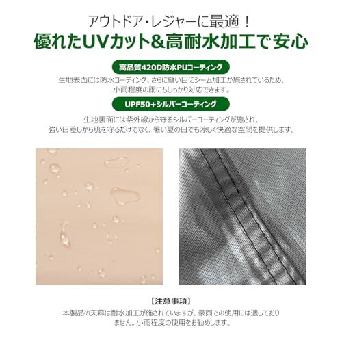 【優れたUVカット&高耐水加工で安心】生地裏面には紫外線から守るUPF50+シルバーコーティングが施され、強い日差しから肌を守るだけでなく、暑い夏の日でも涼しく快適な空間を提供します。さらに、生地表面には高品質420D防水塗装+縫い目からの雨漏れを防ぐシーム加工が施されているため、水を弾き、小雨程度の雨にもしっかり対応できます