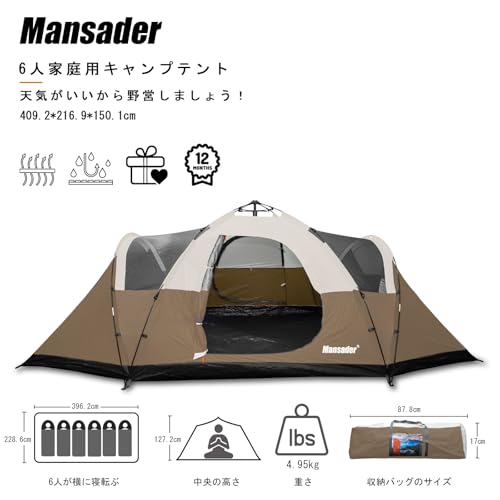 MANSADER 大型ワンタッチテント 6人用 ファミリー 大型テント 二重層 設営簡単 uvカット加工 ワンタッチ キャンプ アウトドア 防風 防災用 耐水圧4000mm 日本語説明書付き