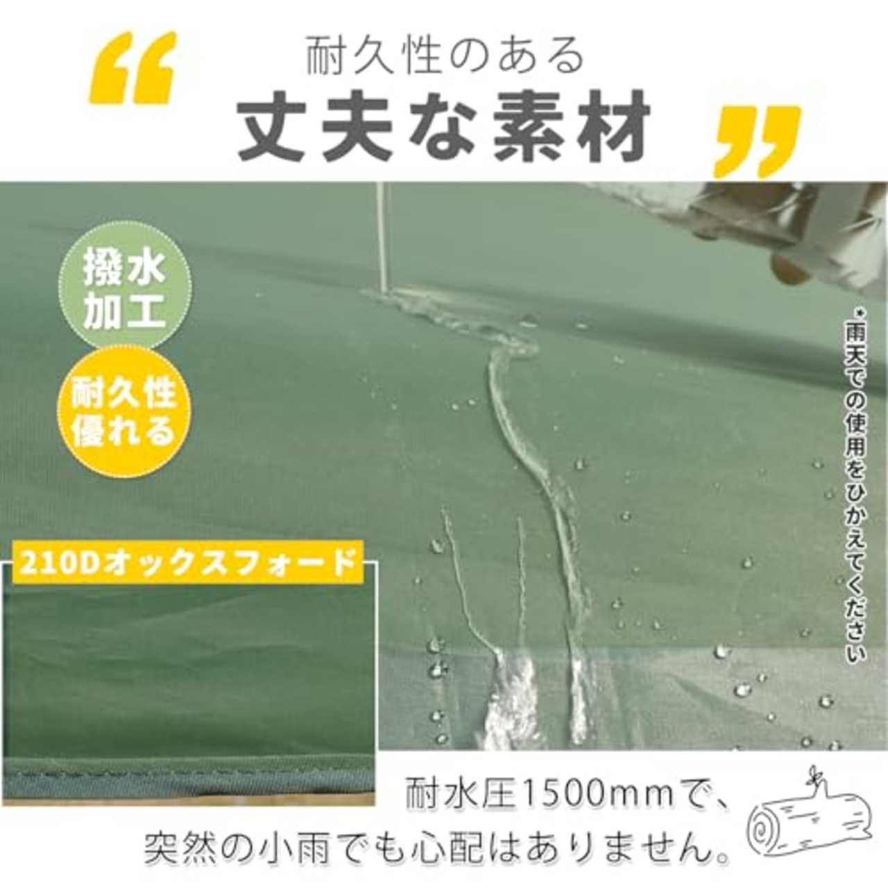 【遮光遮熱&高耐水加工】①UVカット加工を施しており、熱や紫外線を遮断して日陰を作ります。②210D高密度ナイロン生地を採用し、耐水圧1500mmの耐水加工が施しており、雨漏れを防ぎます。