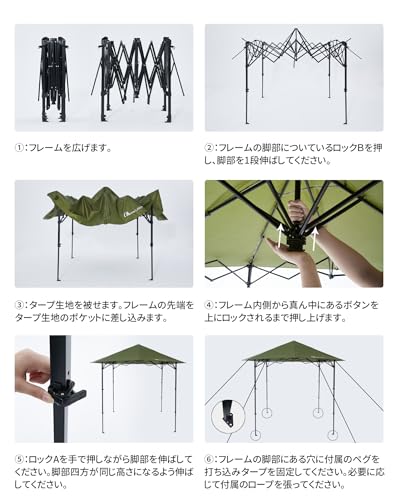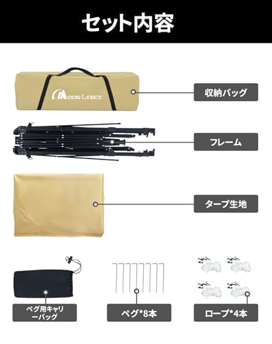【便利なワンタッチテント】MOON LENCEのタープテントは新しいワンタッチ技術を採用し、取付時や撤収時、畳み傘のように、ワンタッチで簡単に操作できる同時に、手が挟まれる危険も防げます。