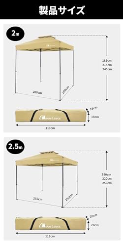 【商品仕様】●組立時サイズ:(約)奥行き2m×幅2m×高さ1.85m/2.15m/2.45m(3段階高さ調整可能) ●収納時サイズ:(約)18cm×18cm×113cm ●セット重量:(約)10.81kg ●フレーム材質: スチール ●シート生地 : 150Dポリエステル