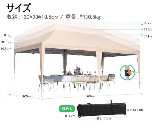 【商品仕様】サイズ:597cm*299cm*257cm / 収納サイズ:127*36*27cm / 重量:約33kg / 付属品:収納バック*1、ロープ*4、ペグ*10/ 素材:スチール、ポリエステル210D。初期不良はと単独購入などはお気軽にご連絡下さい。メールアドレス:[email protected]。風・雨などの自然現象による破損につきましては保証の対象外となりますのでご注意ください。