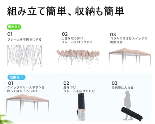 【3段階調節】ボタンを押すと、テントの高さは調節可能です。必要に応じてテントの高さを調節できるため、さまざまなアウトドアの場合で、使用できます。収納袋もついていますので、室外で利用するのは便利です。