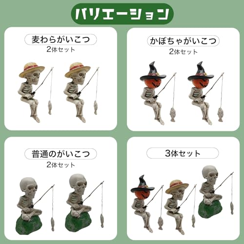 【ユニークなガイコツ釣り像2体セット】 骸骨・スカルモチーフの置物が、釣り竿を持ってのんびりと並ぶ姿に思わずクスッとするフィギュアです。 帽子をかぶった「麦わらがいこつ」や「かぼちゃがいこつ」など、異なる個性が楽しい全4バリエーション。ガーデンや水槽の装飾にもぴったりの存在感です。