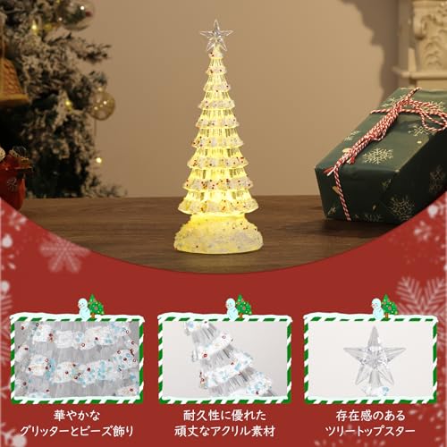 「上質な素材採用したコンパクトな仕様」ガラスより割れにくい耐久性に優れたアクリル素材を採用しており、色あせもなくより長く楽しめます。3つのAA電池で手軽にお部屋の雰囲気を変われます。様々な場所にインテリアとして置くだけで、目が付くたびに癒やされます。パッケージから出した際にすぐ飾れますので、大きなクリスマスツリーを置けないお部屋や、飾り付けやオーナメントの収納に手間を掛けたくない方に大変おすすめする逸品です。