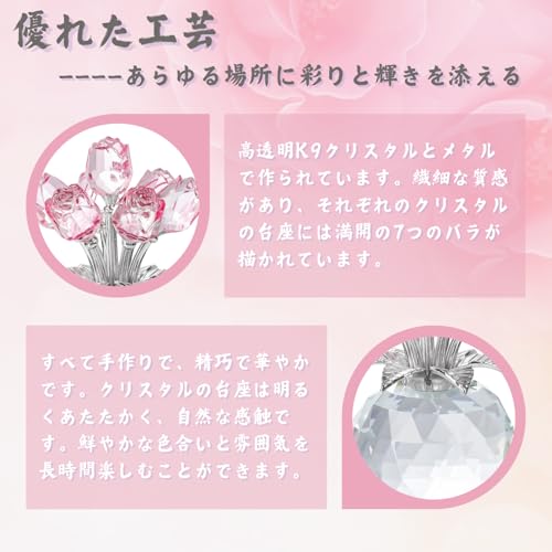 【優れた工芸】高透明K9クリスタルとメタルで作られています。繊細な質感があり、それぞれのクリスタルの台座には満開の7つのバラが描かれています。すべて手作りで、精巧で華やかです。色は明るくあたたかく、手触りは自然です。鮮やかな色合いと雰囲気を長時間楽しむことができます。