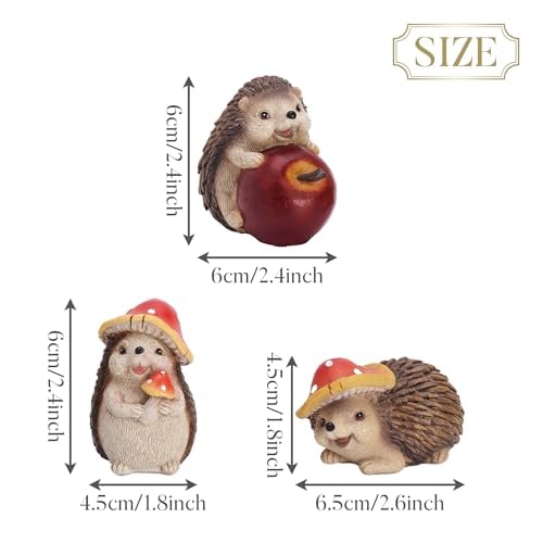 【商品のサイズ】本品秋の飾りセットのハリネズミ像3体のサイズについて、リンゴを抱えたハリネズミは、約幅4×奥行6×高さ6cmです。キノコを抱えたハリネズミは、約幅4.5×奥行4×高さ7.5cmです。うつ伏せのハリネズミは、約幅4.5×奥行6.5×高さ4.5cmです。