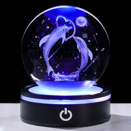 Qianwei イルカクリスタルボール 光る置物 記念日 プレゼント(結婚記念日/誕生日/母の日)彼氏 彼女 妻 両親用 クリスタルガラス細工 内部彫刻 月と星とイルカの愛 K9水晶 直径8cm おしゃれなインテリア雑貨 癒しグッズ ライト付き 夜間照明 | paghag