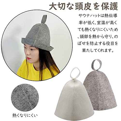 【商品仕様】パッケージ内容:サウナハット 2枚入り サイズ:フリーサイズ カラー:ホワイト、グレー メイン素材: フェルト、熱くなりにくい、抗菌・消臭効果、シワになりにくい。