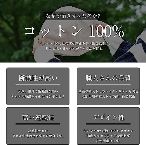今治タオル で有名なの タオル産地 、愛媛県今治市の ブランド 「 今治 タオル 」 そのマークは、今治タオル工業組合独自の認定基準に合格した品質のタオルであることの証です。 プレゼント にお使いいただいても大変喜ばれます。 メイドインジャパン の サウナハット を是非お試しください。毎日使うものはお肌に優しい物を。 コットン を使用した、ずっと頬ずりしていたくなるようなやさしい肌触りの タオル です。 頭皮や髪のダメージを軽減! 深め デザインで目や耳も熱から守ります。 独自の品質基準をクリアした確かな品質 やさしい肌触りと抜群の 吸水性 のハイクオリティの 今治タオル は、お子様にもお使いいただける 今治サウナハット です