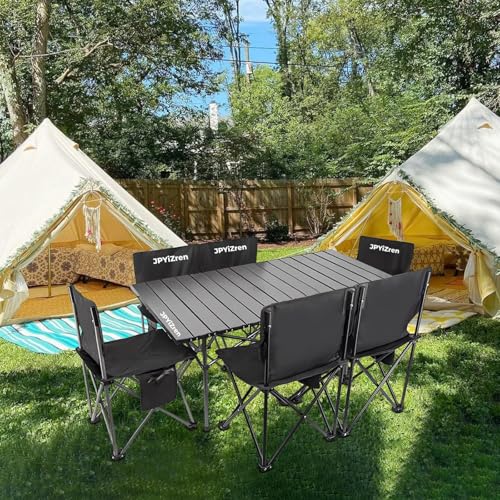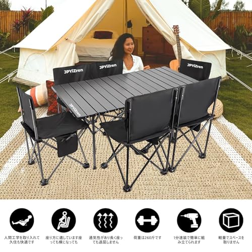 JPYiZren アウトドア テーブル チェア 7点セット アルミテーブル椅子 ピクニック ベンチセット ピクニックテーブル 超軽量 折り畳み 組立簡単 収納バッグ付き BBQ お釣り テント ガーデン 屋外 キャンプ用品 (7, ブラック)