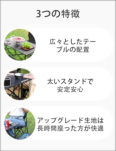 軽量で持ち運びやすい:折りたたみテーブル&チェアセットは、軽量設計で持ち運びや収納が簡単です。折りたたむとコンパクトになり、携帯用バッグも付属しているため、いつでもどこでも屋外活動を楽しむことができます。バーベキューやキャンピングカー旅行、アウトドアでの食事にも便利です