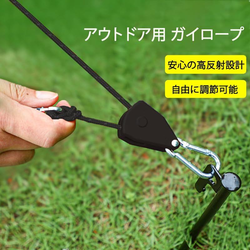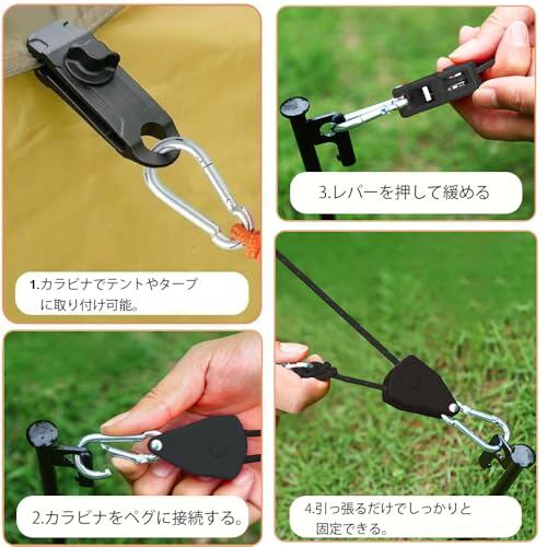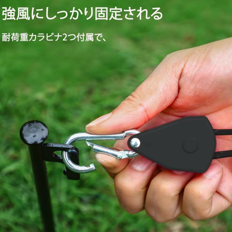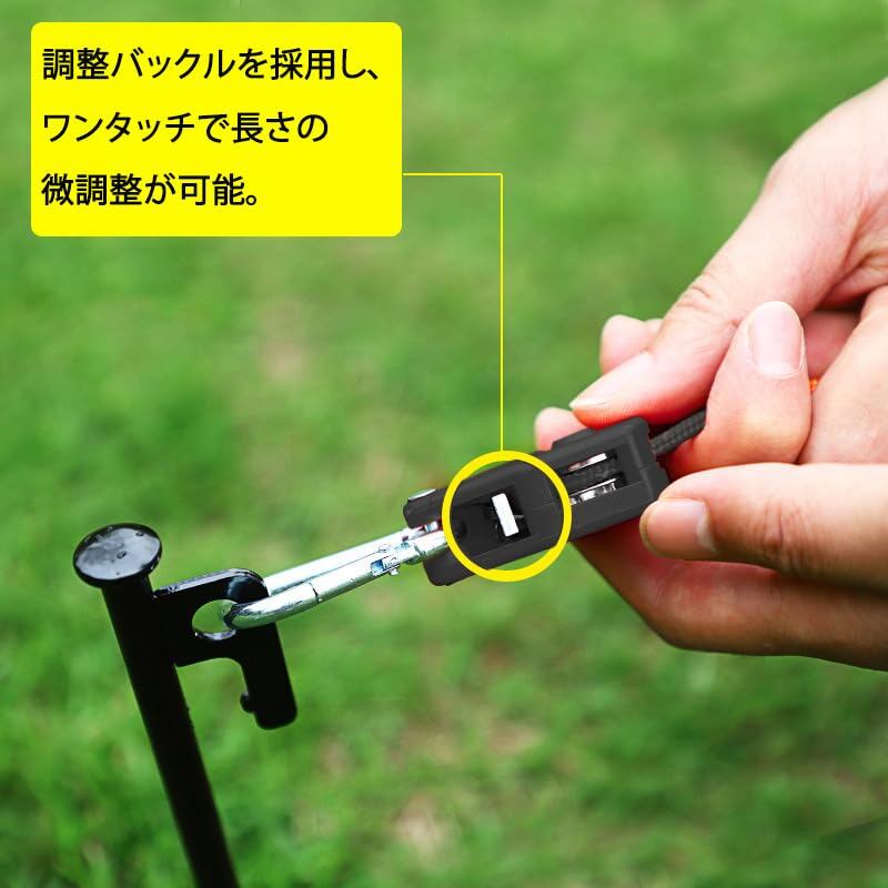 【長さを自由に調節可能】タープロープにはアルミ合金製調整バックルを採用し、ワンタッチで長さの微調整が可能。滑り止め設計でしっかり固定され、強風時でも緩みません。付属の自在金具とカラビナで、テントやタープの設営が驚くほどスムーズに。初心者の方でも簡単にご利用いただけます。