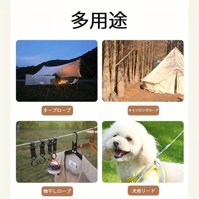 【多用途】こちらのガイロープはキャンプやタープ設営はもちろん、物干しロープ・ランタン吊り下げ・ハンモック固定など、アウトドアで幅広くご利用いただけます。さらに、庭仕事や災害時の応急用としても便利です。