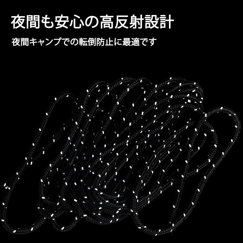 【夜間も安心の高反射設計】当テントロープ には2本の反射材ワイヤーを編み込み、他社製品よりも高い視認性を実現します。わずかな光でも強く反射するため、夜間キャンプでの転倒防止に最適です。蛍光カラーとのダブル効果で、昼間の視認性も抜群。お子様やペットのいるご家庭でも、安心してご利用いただけます。