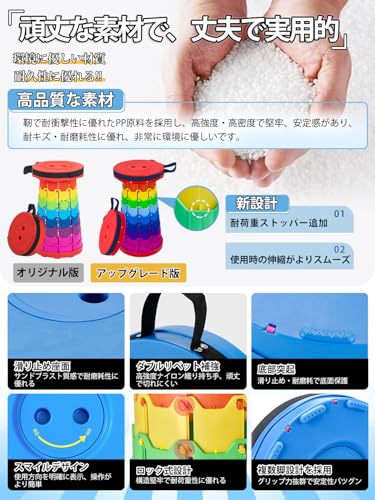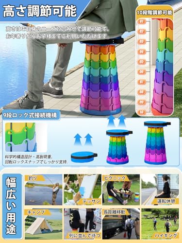 【高い耐荷重能力】わずか935gの軽さにもかかわらず、当社の伸縮式アウトドアチェアは最大200kgの重量に耐えることができます。これは、頑丈なABSとポリアミド素材を使用し、9つの高さ調整と固定デザインを採用したためです。その結果、非常に安定性が高いです。(商品の重量は約935gですが、各製品の実測重量には多少の誤差が生じます。)