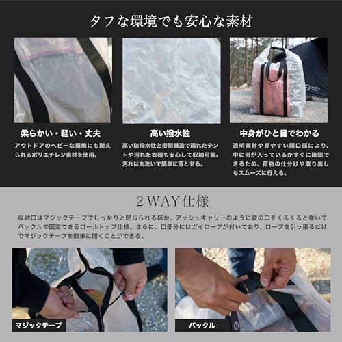 【防水&丈夫なポリエチレン素材】 ポリエチレンは柔らかい・丈夫・高い防水&撥水性でアウトドアのヘビーな環境にも耐えられる素材。 汚れも拭くか丸洗いすれば簡単に落とせて衛生的です。透明なので中身に何が入っているかわかりやすいです。