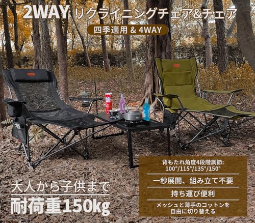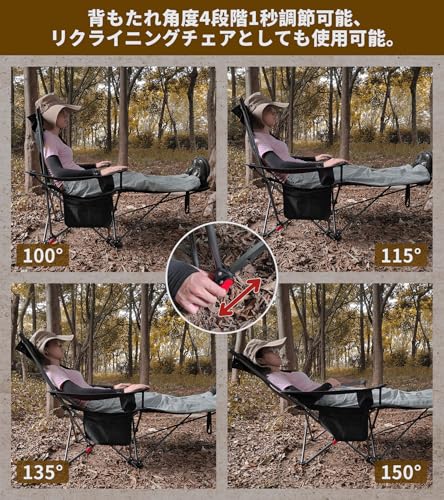 ✅【4段階調節】背もたれの角度は100°-115°-135°-150°の4段階で1秒調節でき、お好みの角度でゆったりお過ごしいただけます。キャンプ、焚き火、リビングルーム、バルコニー、オフィスなど、様々なシーンでのニーズに対応しています。