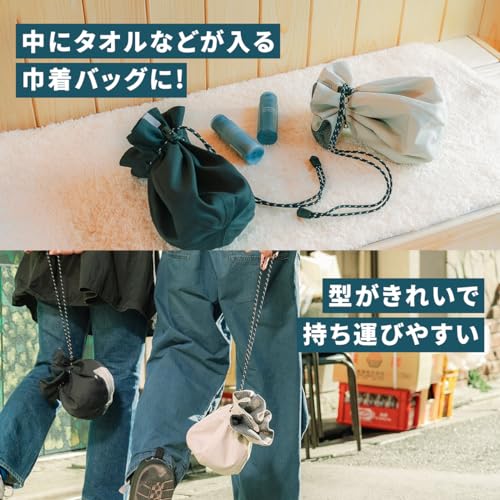 【巾着バッグ】ドローコードを絞ることで巾着バッグとして、化粧水やミニタオルなどを入れてサウナに。