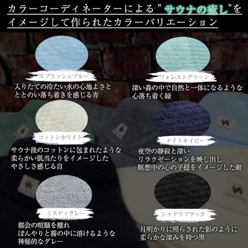 【繊細に調色したカラバリ】カラーコーディネータによる、サウナの癒しをイメージして作られたカラバリ5色展開。どの色も、見るだけで癒しを想起させ、メンズ、レディースどちらも使える色合いに調色。