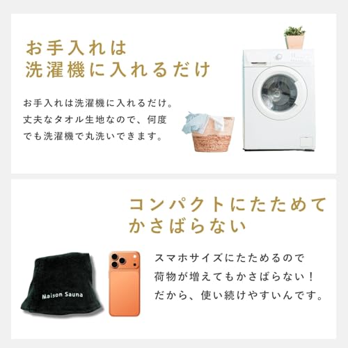 [お手入れは洗濯機に入れるだけ]丈夫なタオル素材を使って製作しているためサウナから帰ってきたらそのまま洗濯機に入れるだけでお手入れ完了です。
