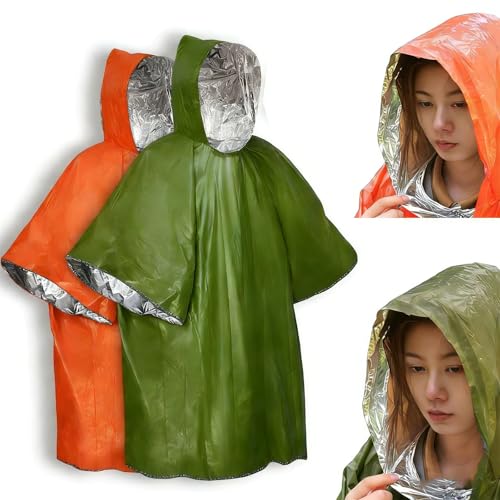[FUYUERO] 防災グッズ アルミポンチョ サバイバルグッズ アルミ寝袋 防水 防風 防寒 保温 手軽登山 アウトドア ポンチョ 地震用 応急処置レインコート 男性 女性 大人用 キャンプ ハイキング 緊急用品 サバイバルキット( 2アイテム オレンジ色 アーミーグリーン)