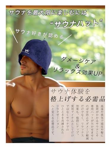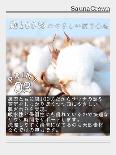 【高い断熱性と吸水性を兼ね備えた綿100%】表裏ともに綿100%素材だからサウナの熱や蒸気をしっかり遮りつつ頭にやさしい肌ざわりを実現。吸水性と保温性に優れ、ゴムバンド付きで頭にフィットするため、快適なサウナタイムをサポートします。